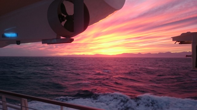 Viimeinen risteilypäivä on vaihtumassa iltaan ja huomenna laiva palaa takaisin Barcelonaan. Auringonlasku on ehkä komeampi kuin koskaan eikä noin 20 m/s puhaltava tuulikaan keinuta laivaa. Tälle reissulle kannatti todellakin lähteä.