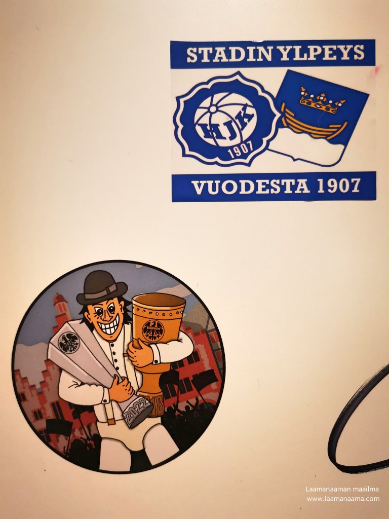 Ajattelin, että Kaisaniemessä olisi ollut vähän enemmän menoa, joten lähdin katselemaan olisiko jossain janoisia saksalaisia joiden sekaan liittyä. Stockmannin liepeillä huomasin, että Kalevankadun kulmaus on täynnä Eintracht-paitoja ja syykin löytyi. Koffin tuoppeja myytiin erinomaiseen 3,50 euron kappalehintaan. Ei muuta kuin peremmälle, tuopit kouraan ja ulos seuraamaan meininkiä. Ohikulkijat katsoivat ihmeissään, kun yhtäkkiä satakunta frankfurttilaista alkaa laulamaan lauluja, jotka kuuluvat helposti Stockan kellon allekin. Nyt alkaa olemaan jo sellainen meininki kuin olettaa saattaakin. Muutamtuopin jälkeen on aika lähteä hiljalleen kohti stadionia.