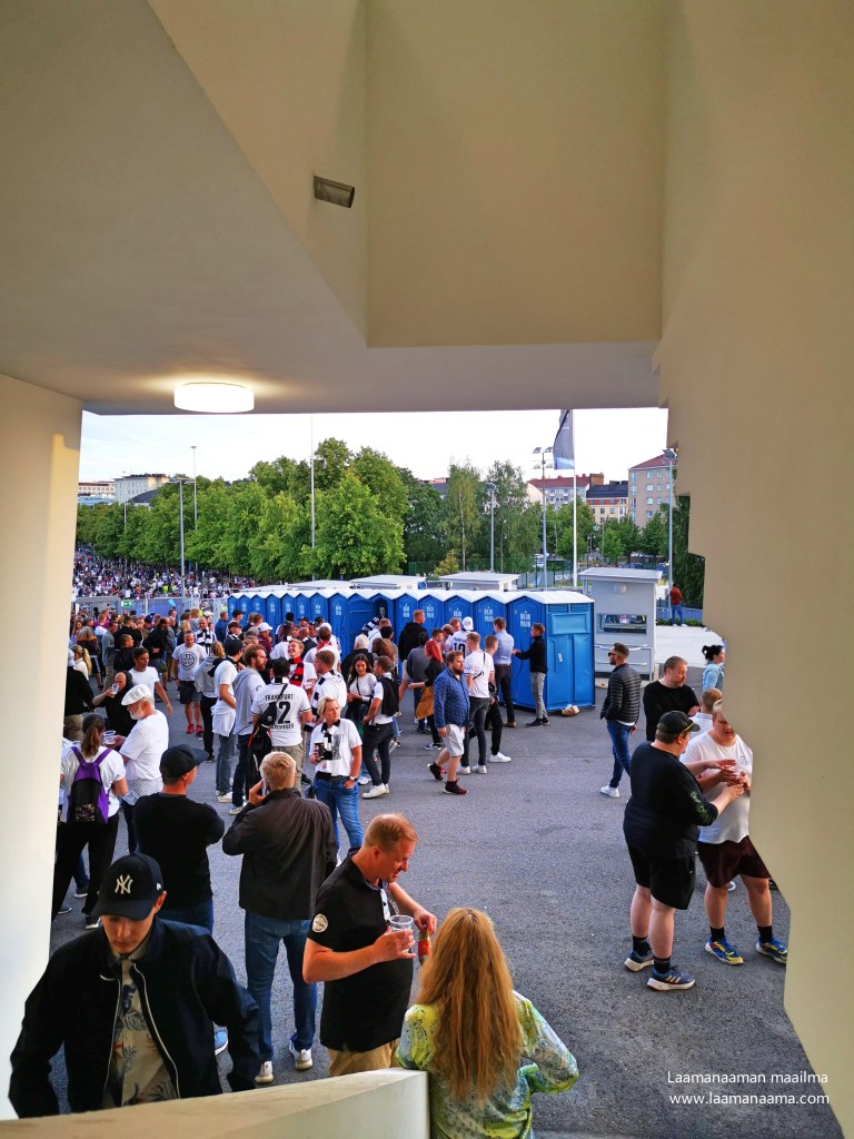 Puoliajalla jonot loppuunmyydyllä stadionilla on valtavat. Vaihtoehtoina on joko jonottaa 20 minuuttia 10 euron hintaista Heinekeniä tai käydä vessassa. Molempia ei kannata tehdä tai voi varmuudella sanoa heipat toisen puoliajan ensimmäisille minuuteille. Mieleen tulee väkisinkin ajatus, että miten ihmeessä tämä homma ei Suomessa toimi edes vähää alusta?