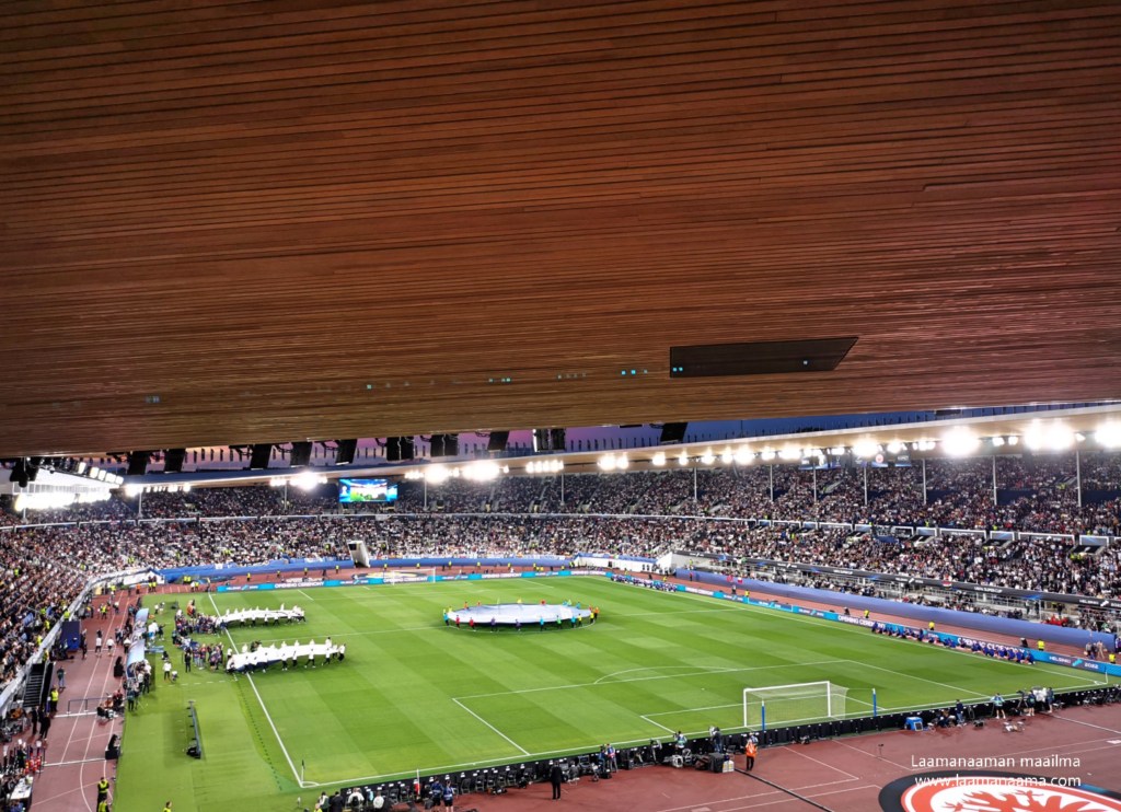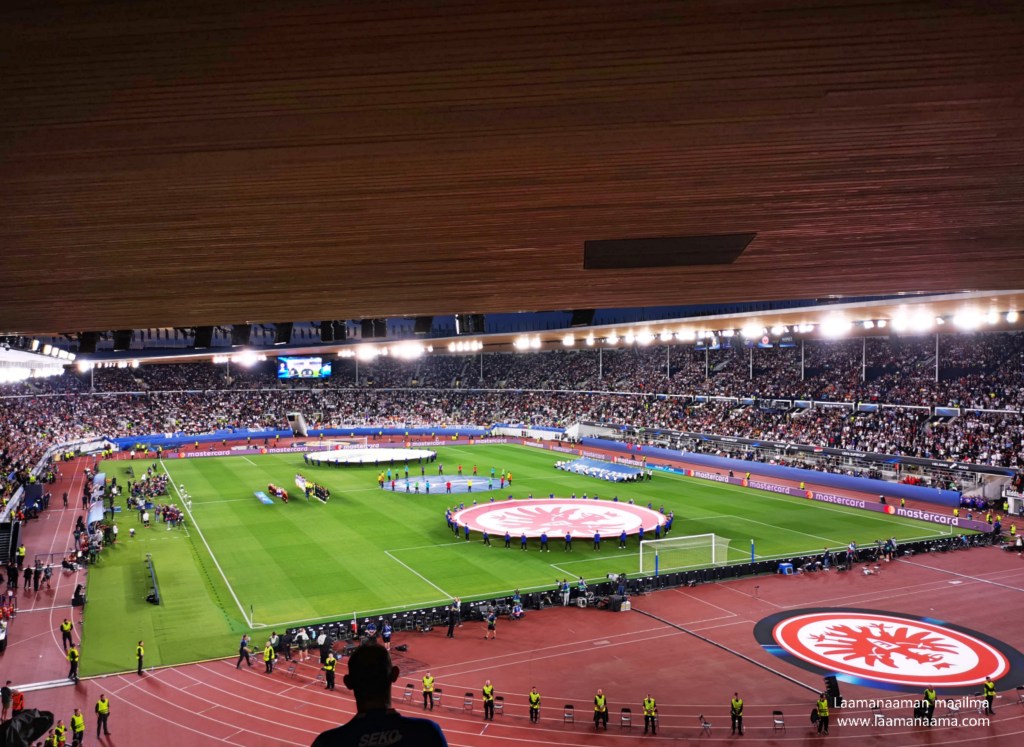 Joukkueet tulevat lämmittelyyn ja saavat molemmista päädyistä kovat suosionodotukset. Silmämääräisesti Eintrachtin kannattajia on paikalla huomattavasti enemmän ja suurin osa Realia kannattavista tuntuukin olevan suomalaisia vaikkakin espanjastakin on tullut joitain tuhansia kannattajia paikalle. Ennen ottelua kuullaan molempien joukkueiden seurahymnit, nähdään avajaisshow ja pian näiden pakollisten ”spektaakkeleiden” jälkeen ottelu on valmis alkamaan.