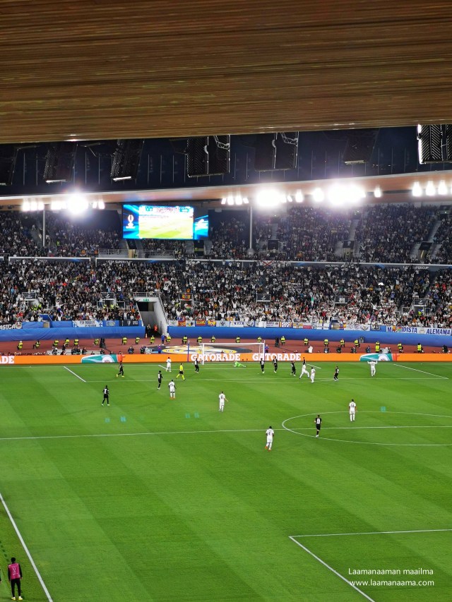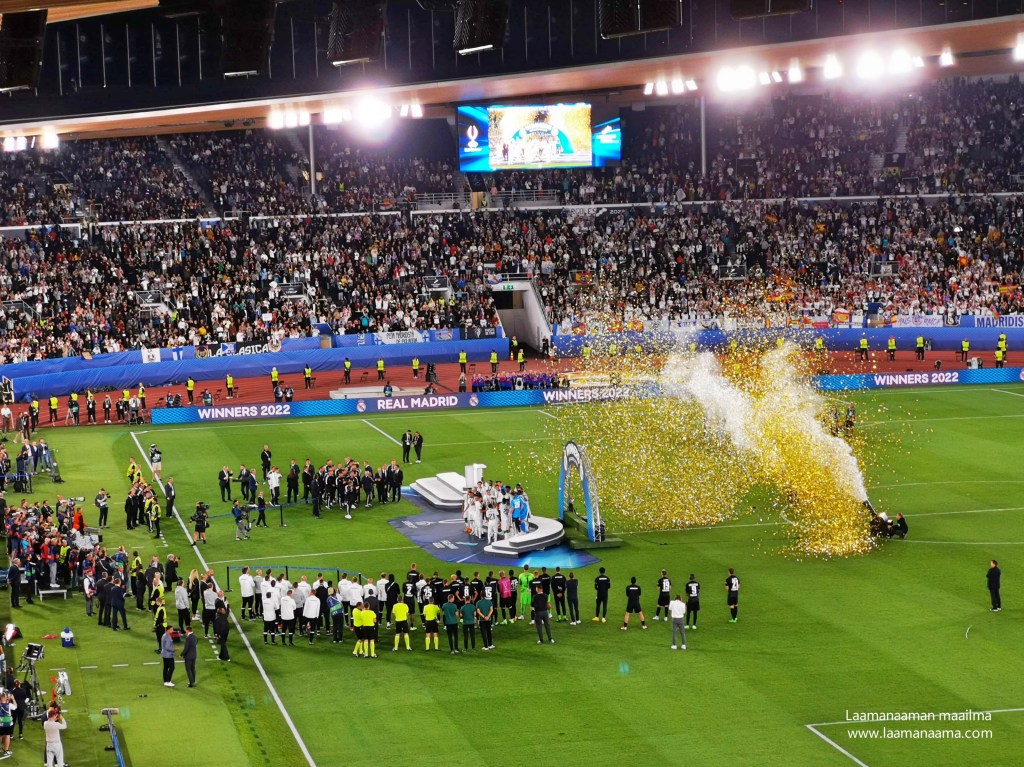 Palkintoseremonien käynnistymiseen menee kiusallisen pitkä aika ja yleisökin pitkästyy. Molemmat joukkueet hengailevat omissa oloissaan ja odottelevat. Lopulta matot, palkintostandit ja muut asiaankuuluvat vermeet saadaan paikoilleen, ja joukkueille mitalit kaulaan sekä Realille uusi pytty Santiago Bernabeun kaappeihin. Poistumme stadionilta Hala Madridin soidessa.