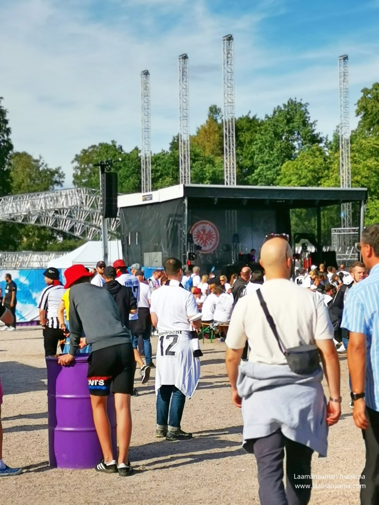 Eintrachtin kannattajilla oli tarkoitus toteuttaa komea yhteismarssi pääkallopaikalle, mutta ilmeisesti homma jäi vähän piippuun eikä mitään kovin isoa spektaakkelia nähty. Koska missasimme marssin 3,50 maksaneiden tuoppien johdosta jäämme hetkeksi kuuntelemaan Markku ”Rive” Kanervan haastattelua Kansalaistorilla, johon alkaa kerääntymään ilman lippua jääneitä ihmisiä katsomaan matsia.