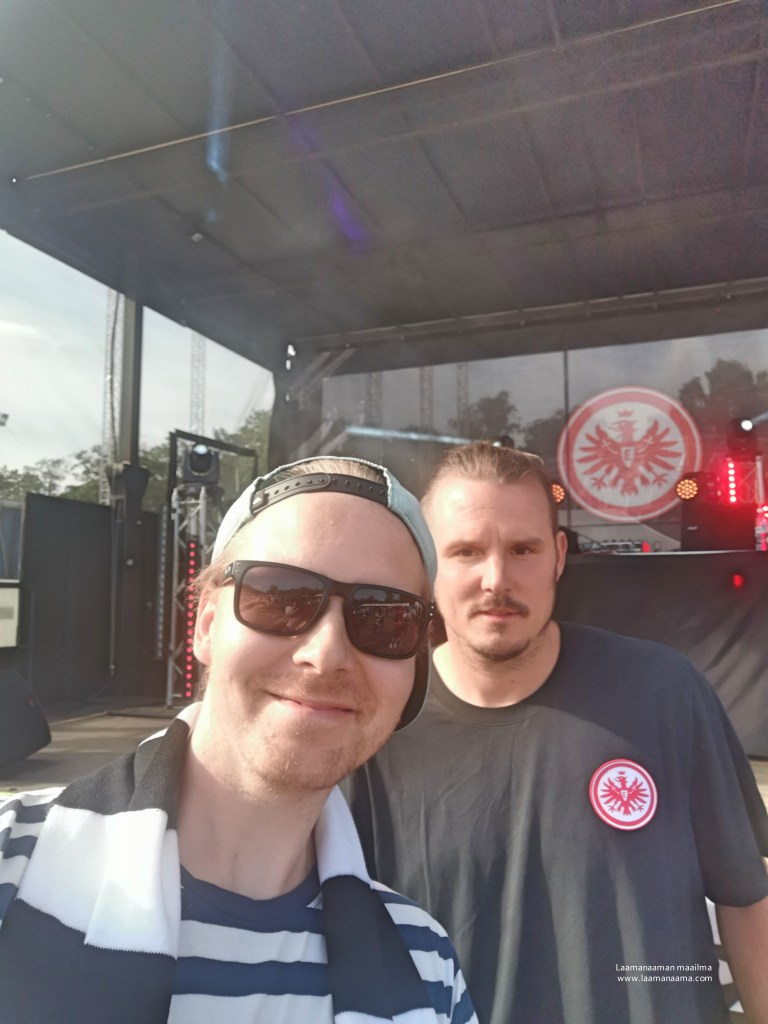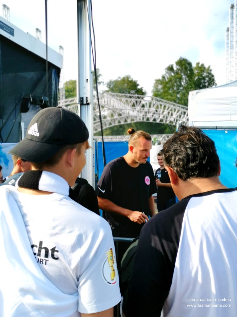 Huivi tarttuu mukaan 25 euron suloiseen hintaan ja jatkan matkaa kohti Kaisaniemeä, jossa Eintracht Frankfurtin kannattajat kokoontuvat omalle fanialueelleen. Matkalla tulee joka paikassa vastaan saksalaisjoukkueen kannattajia, mutta myös Realin paitoja näkyy katukuvassa, joskin ne jäävät selvästi vähemmistöksi. Kaisaniemen kentällä on ehkä parisentuhatta ihmistä ja leppoisa tunnelma. 8,50 euroa maksavia Heineken-oluita menee, mutta mitään suurta karnevaalitunnelmaa ei ole havaittavissa. Lavalla on juuri ollut haastattelussa Eintracht-legenda Alexander Meier ja fußballgott jää antamaan faneille nimmareita ja ottamaan selfieitä. En ole juurikaan selfie-mies ja vielä vähemmän nimmarimies, mutta päätän kaveria odotellessa siirtyä jonon jatkoksi ja nappaan selfien suosikkiseurassani FC St. Paulissakin pelanneen Meierin kanssa.