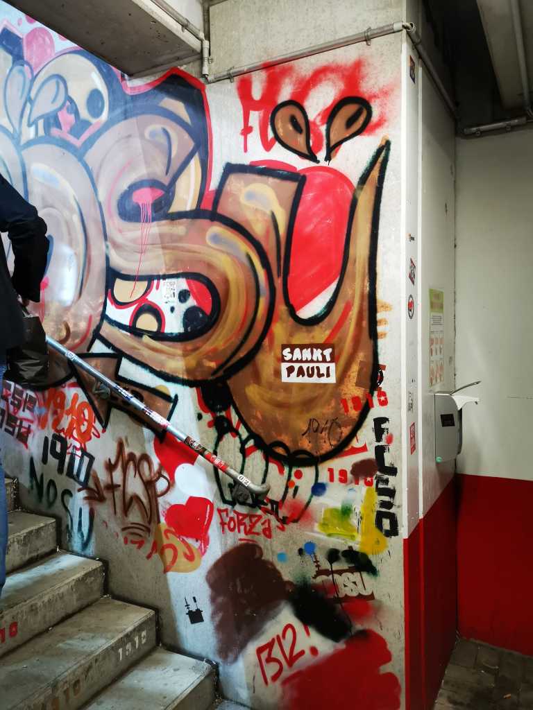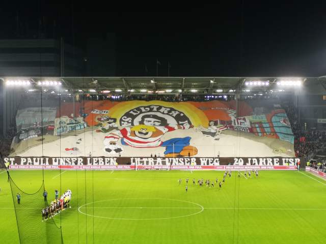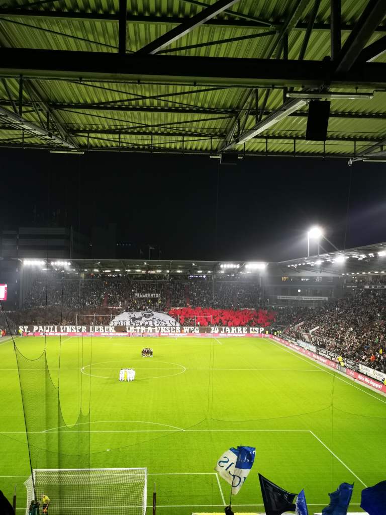 Muutama minuutti ottelun alkuun. Vaihtopelaajat kävelevät hiljalleen kentän poikki ja yleisössä alkaa kohina. SV Darmstadtin kannattajat pitävät vieressämme erinomaista meteliä, mutta heidän ääni hukkuu, kun legendaarisen Hell’s Bellsin kellot alkavat soida. Ultrà Sankt Paulin kannattajilla on 20-vuotisjuhlat ja eteläpäädyn ylle laskeutuu upea tifo. Siellä täällä lentää ilmaan paperisilppua, liput liehuvat ja yleisö huutaa SANKT PAULI, SANKT PAULI. Tämän takia Millerntorille kannattaa tulla.