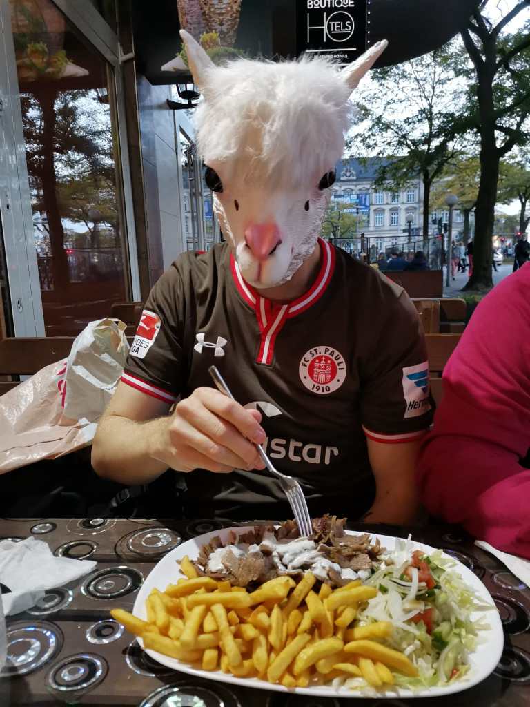 Hampuri lauantai 29.10. klo 17:30. Ah, saksalainen dönerkebab, ei ole parempaa. Juominen ei ole unohtunut, mutta syömistäkään ei sovi unohtaa mikäli aiomme jaksaa päivän toisen 2. Bundesligaottelun (ensimmäisessä Fortuna Düsseldorf haki voiton Kielistä) sekä sen jälkipelit. Suuntaamme ravittuna kohti Reeperbahnia, jonka välittömässä läheisyydessä, sijaintiinsa nähden yllättävän hiljaisella sivukadulla, hotellimme sijaitsee. Tällä kertaa meidän ei tarvitse ravata munaravia, mutta lepääminenkin voisi koitua kohtaloksi. Siispä pienten freshausten jälkeen herättelen lassekukkosmaisella tsempillä matkaseurueen ja lähdemme pienen Herbertssra..Reeperbahn-kierroksen jälkeen kohti Millerntoria, tuota omalaatuisten ihmisten omalaatuista stadionia, jossa kaupungin kapinallisseura FC St. Pauli pelaa.