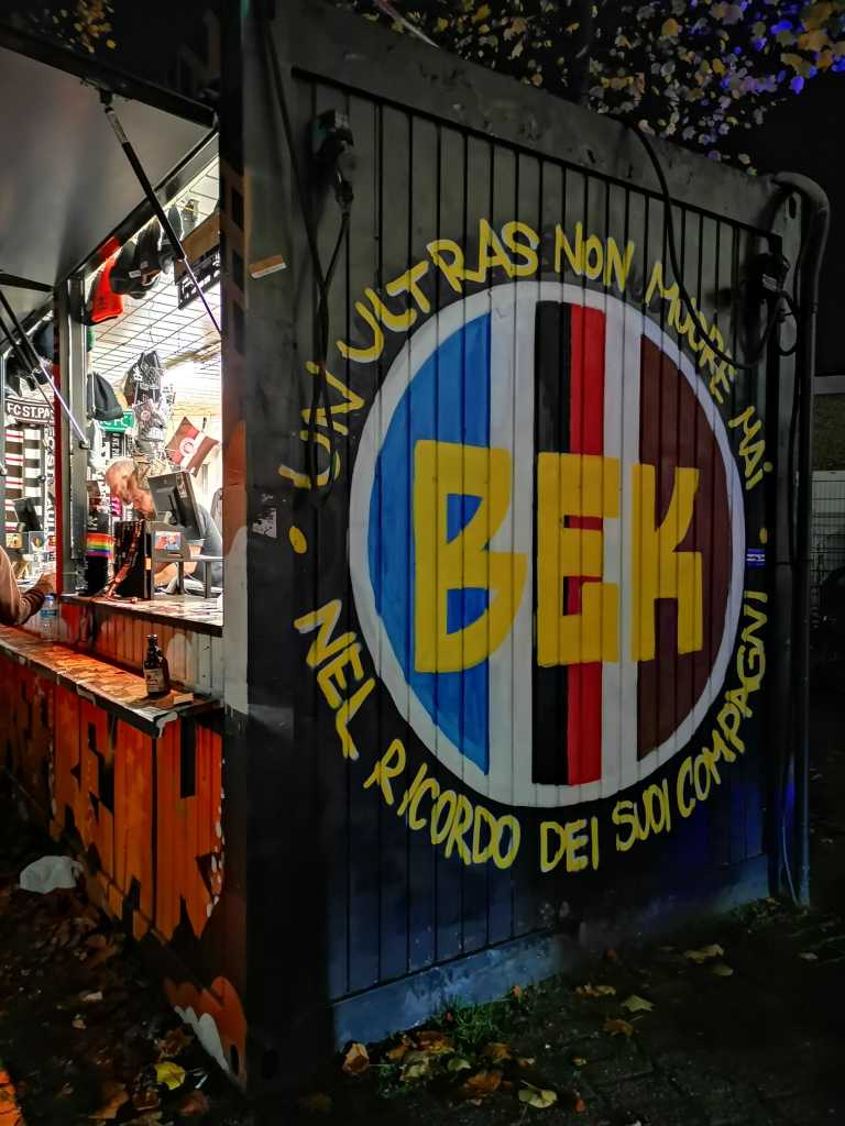 Pohjoispäätyynkin on tullut rummut sitten viime vierailun ja tunnelma on parempi kuin aiemmin kerroilla. Pohjoispääty lähtee mukaan vastapäisen ultrapäädyn lauluihin ja usein aloittaa myös omat chanttinsa. Laulun lomassa takanani seisova nuori nainen alkaa huutaa minulle saksaksi, mutta en ymmärrä sanaakaan. Sanon hänelle, että englantia kiitos, mutta hän päättää kertoa asiansa Mailapojalle, englanniksi. Piponi kuulemma osuu häntä naamaan. Selevä. Myös muut ympärillä olevat ovat kiinnostuneita minusta ja Mailapojasta, kun tajuavat että emme ole paikallisia. Ensin he kyseenalaistavat miksi olemme täällä, tiedämmekö mitään seurasta ja muuta vastaavaa. Saamme heidän vakuuttuneiksi, ettei nyt olla ihan ensimmäistä kertaa paikan päällä ja tässä ollaan ihan aidosti ruskeapaitojen puolella. Mailapojan vieressä oleva mies kertoo tekevänsä businessta Tampereen suuntaan ja yhtäkkiä olemmekin ylimpiä ystäviä.