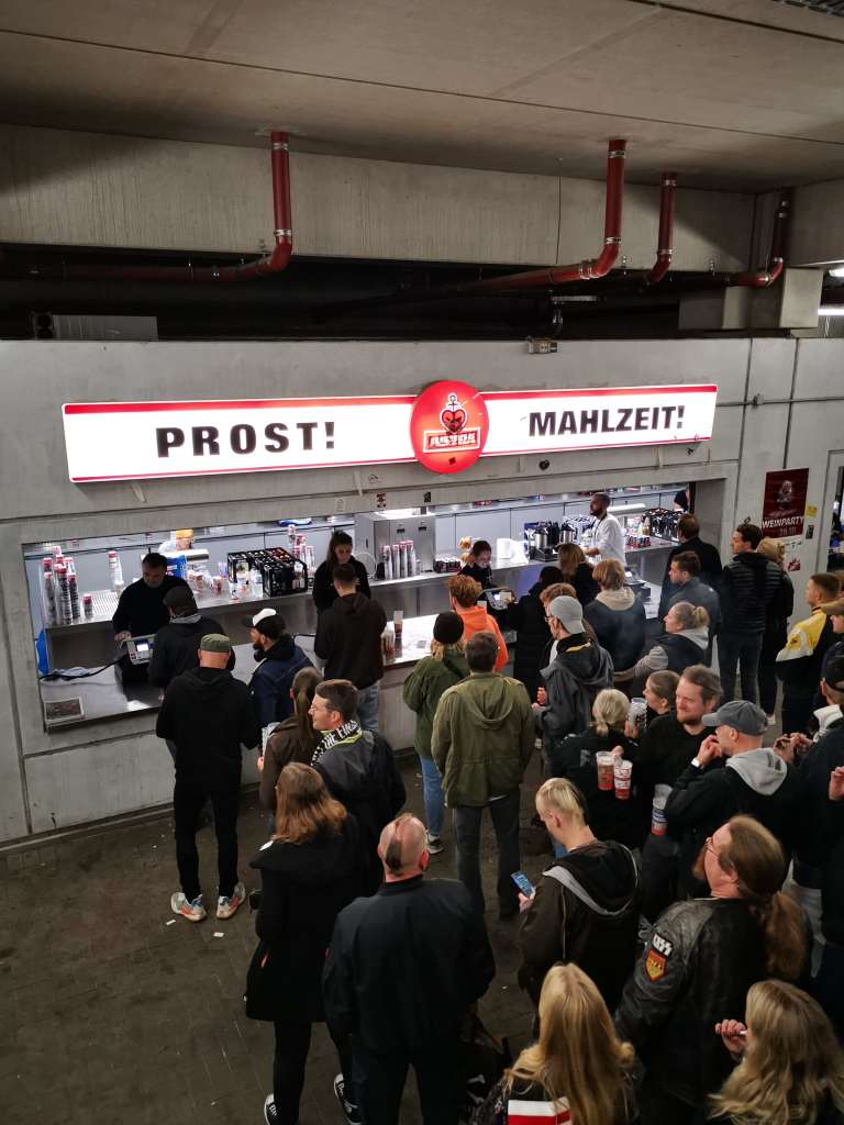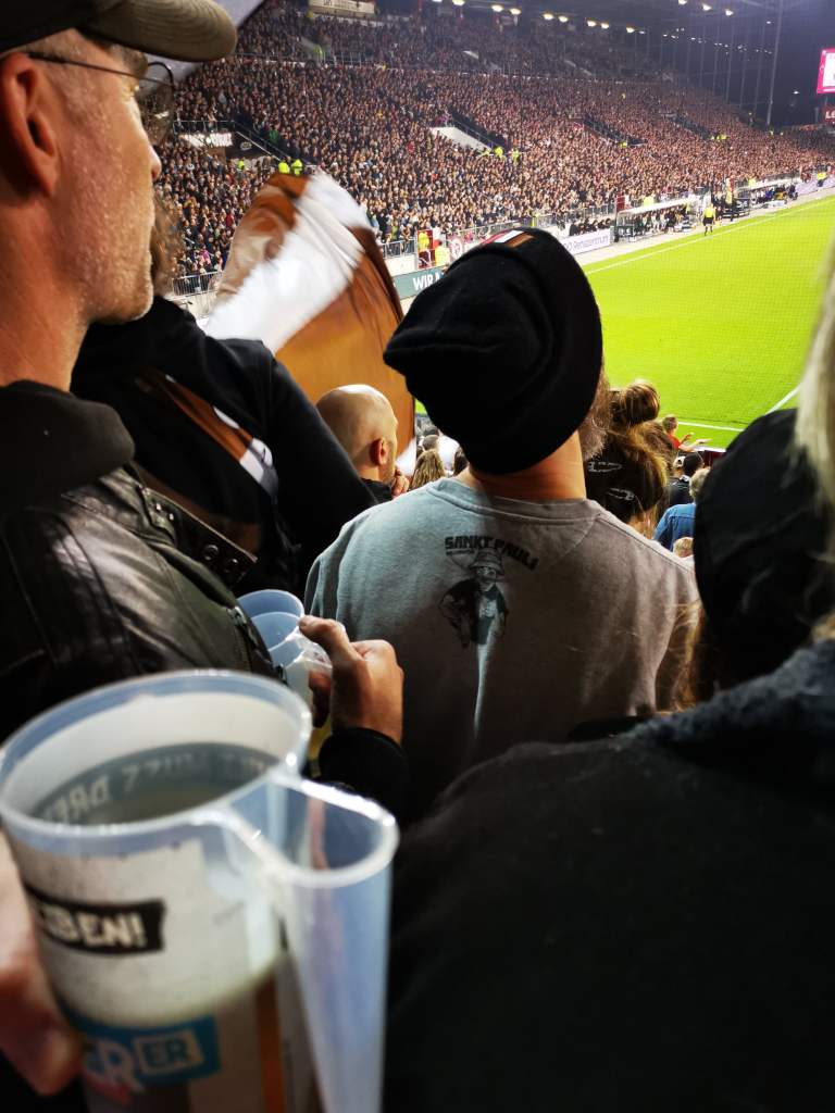 Pienen jonottelun jälkeen olemme sisällä stadionin pohjoispäädyssä. Meille on muodostunut vakiopaikoiksi juuri tuo pääty, osin siitä syystä, että sinne saa lipunmyynnin alkaessa yleensä parhaiten liput usealle hengelle. Meillä on paikat melkein piippuhyllyllä keskellä päätyä, parin metrin päässä möykkäävät Darmstadtin kannattajat. Nappaamme luonnollisesti Astra-oluet katsomoon ja jäämme odottelemaan joukkueita kentälle. Maailman tapahtumien vuoksi FC St. Pauli joutui nostamaan Astran hintaa kaudelle 2022-23 ensimmäistä kertaa kahdeksaan vuoteen. Tuopin hinta nousi 4,70 euroon neljästä eurosta. Myös Bratwurstin hinta nousi 50 sentillä 3,30 euroon ja currywursti 60 sentillä 3,80 euroon. Silti hinnat tuntuvat suomalaisesta edulliselta. Samalla kun saavumme paikoillemme soi stadikan ämyreistä Das Herz von St. Pauli-kappaleen punk-versio ja yleisö viihtyy.