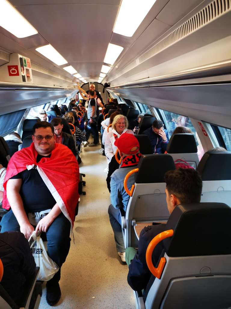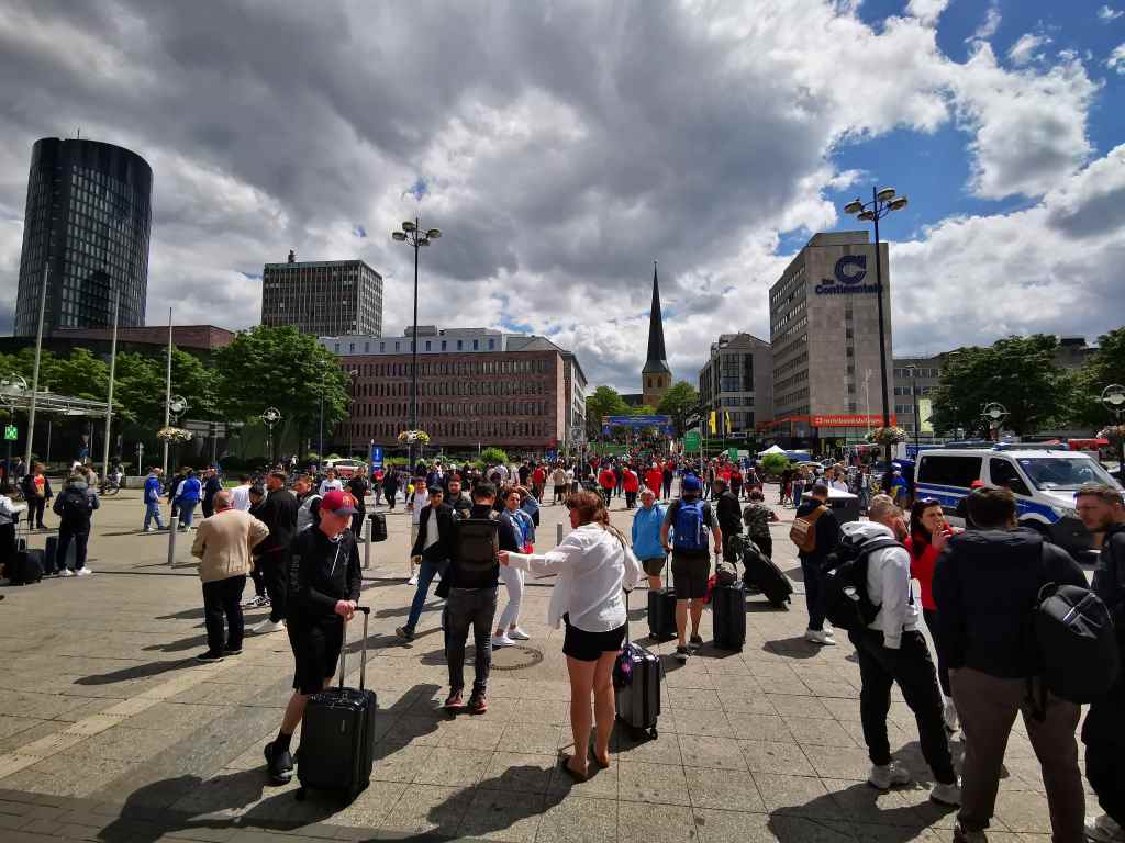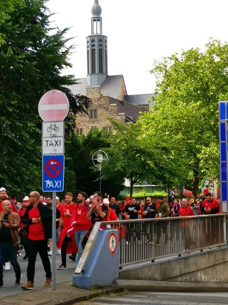 Junia Dortmundiin lähti Düsseldorfin HBF:ltä noin puolen tunnin välein. Pääsimme Fan Passien avulla matkustamaan paikallisjunissa ilmaiseksi, joten hyppäsimme seuraavan mahdollisen junan kyytiin ja fiilistelimme. Tunnelma vaunussa oli yllättävän hillittyä, mutta tuntia myöhemmin Dortmundissa ei. Mustakeltaisesta Borussia Dortmundin kotikaupungista oli tullut punainen. Albanian kannattajia oli kaupungissa yli 50 000.