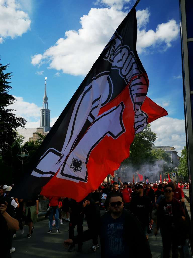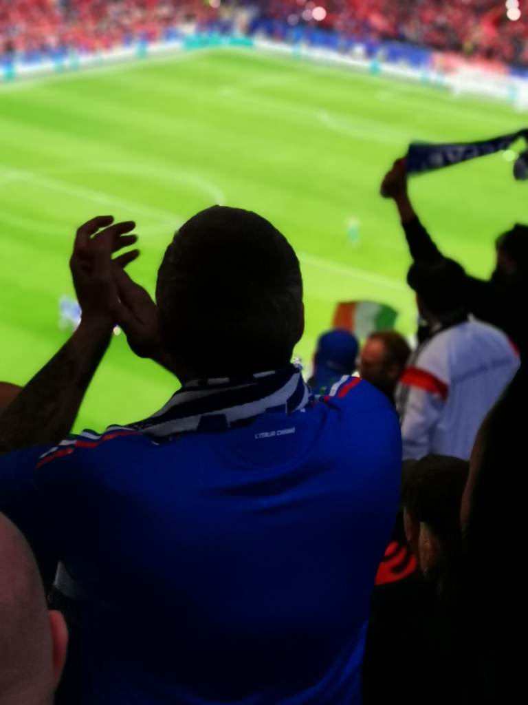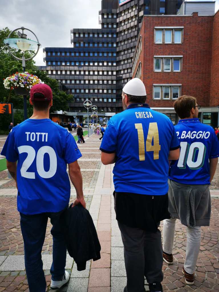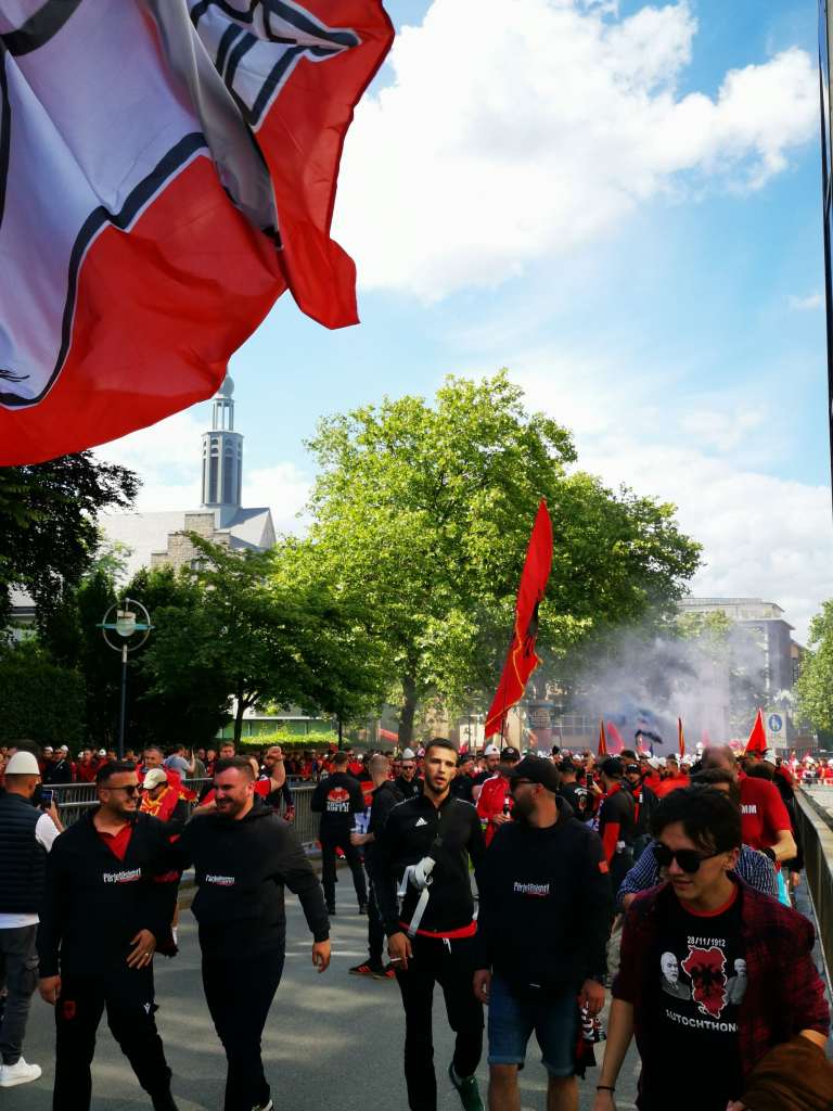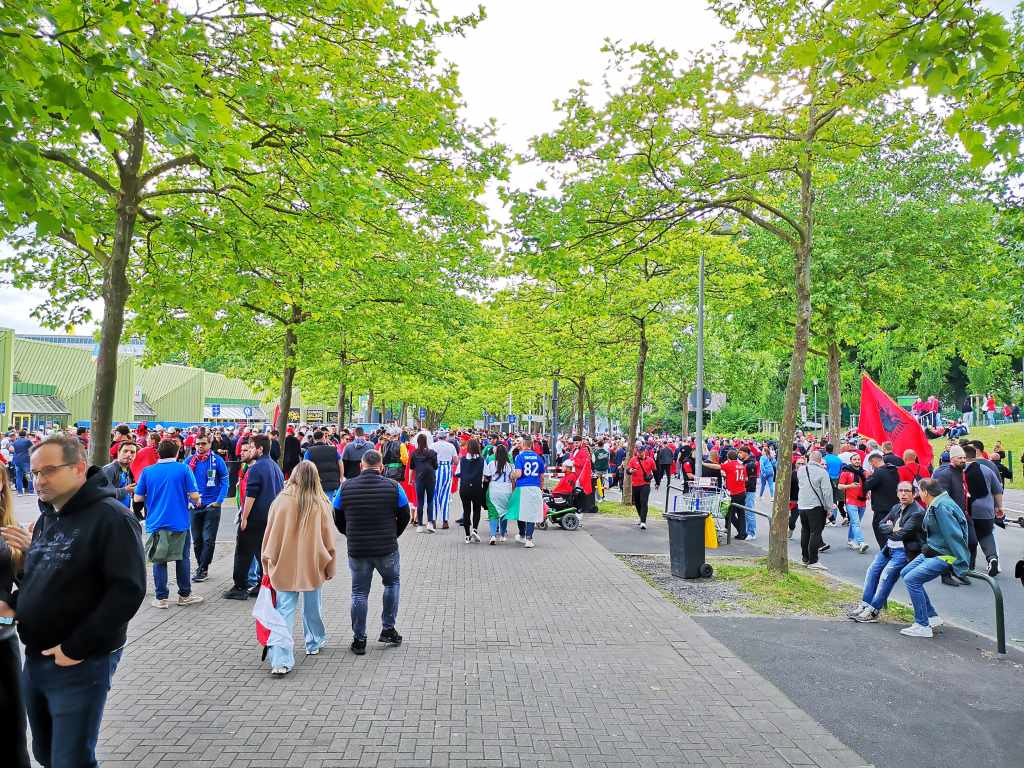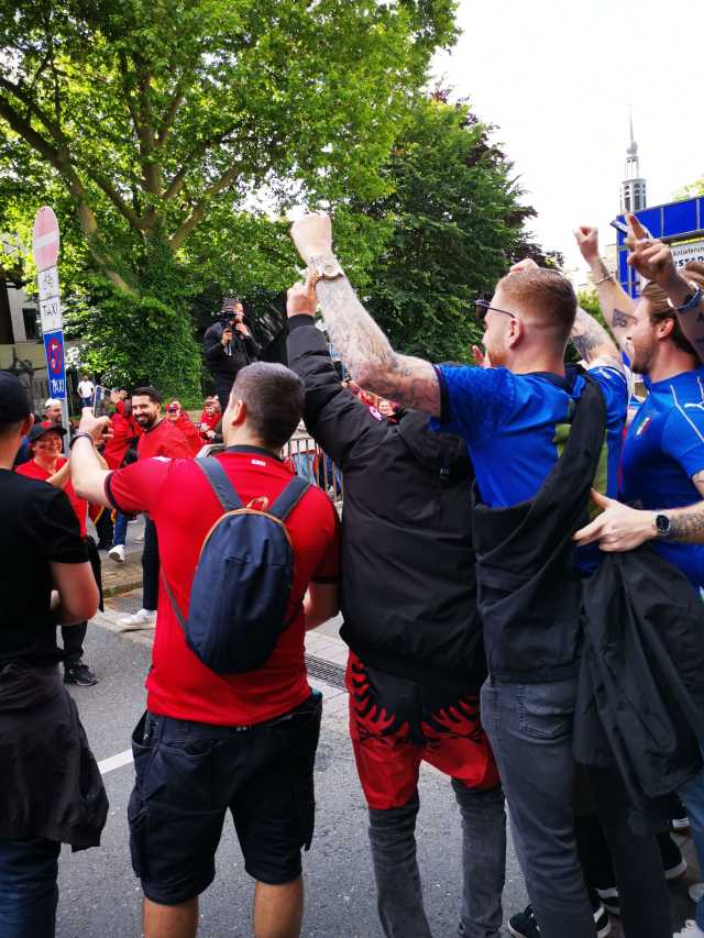 Ajattelimme ensin käydä Fan Zonella katselemassa iltapäivän peliä, mutta se oli kovan tuulen vuoksi suljettu. Ehkä vähän hätäinen ratkaisu, sillä vaikka kaupungissa tuuli, en usko, että siitä olisi haittaa ollut. Löysimme kuitenkin hyvän korvaavan terassin, joka osoittautui loistavaksi paikaksi, sillä terassilta pystyi seuraamaan sekä iltapäivän ensimmäistä peliä että peliin käveleviä kannattajia. Pian alkoi tapahtua. Juttelimme saksalaisten sekä italialaisten kannattajien kanssa niitä näitä, kunnes yht’äkkiä ei enää kuullut jutella, sillä Albanian kannattajien marssi oli alkanut. Reilun tunnin ajan jatkunut jatkuva ihmismeri oli vaikuttavan näköinen ja kuuloinen. Pääsimme myös todistamaan viraalihitiksi nousutta spaghettien katkomista italialaisten silmien edessä ja tarkkasilmäisemmät voivatkin bongata videolta minut ja Mieskarkin. Italian Modenasta kotoisin oleva nuori kannattaja kertoi, ettei maiden tai sen kannattajien välillä ole kaunaa ja siltä se näyttikin. Keskenään halailevat ja iloitsevat kannattajat olivat hieno näky.