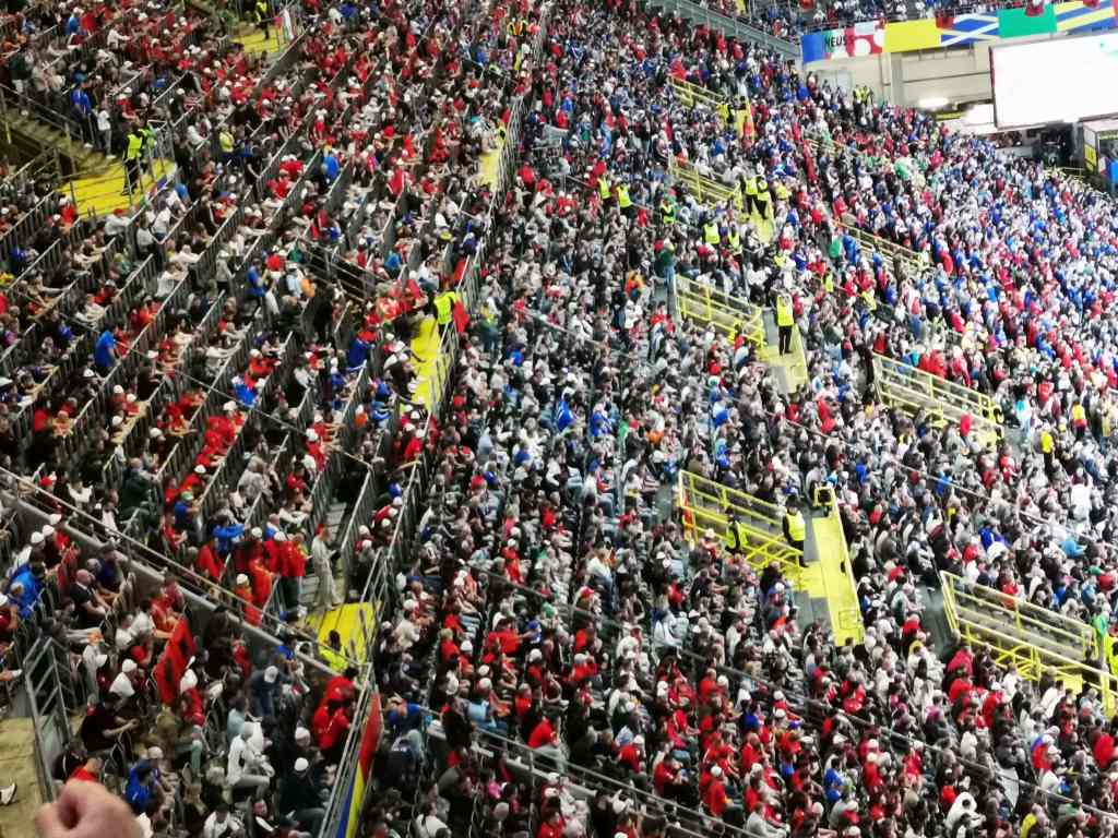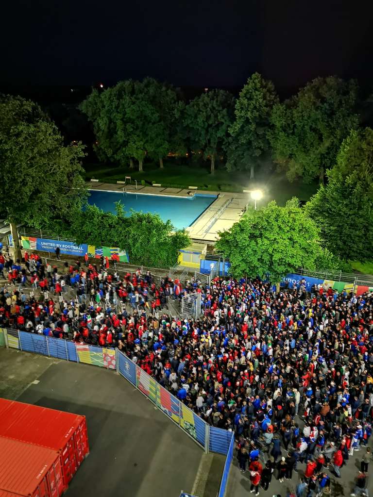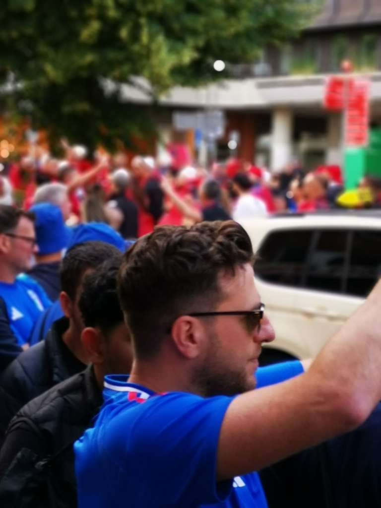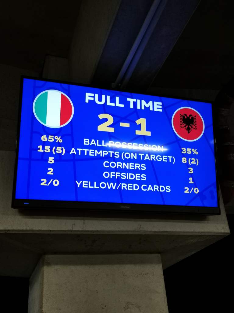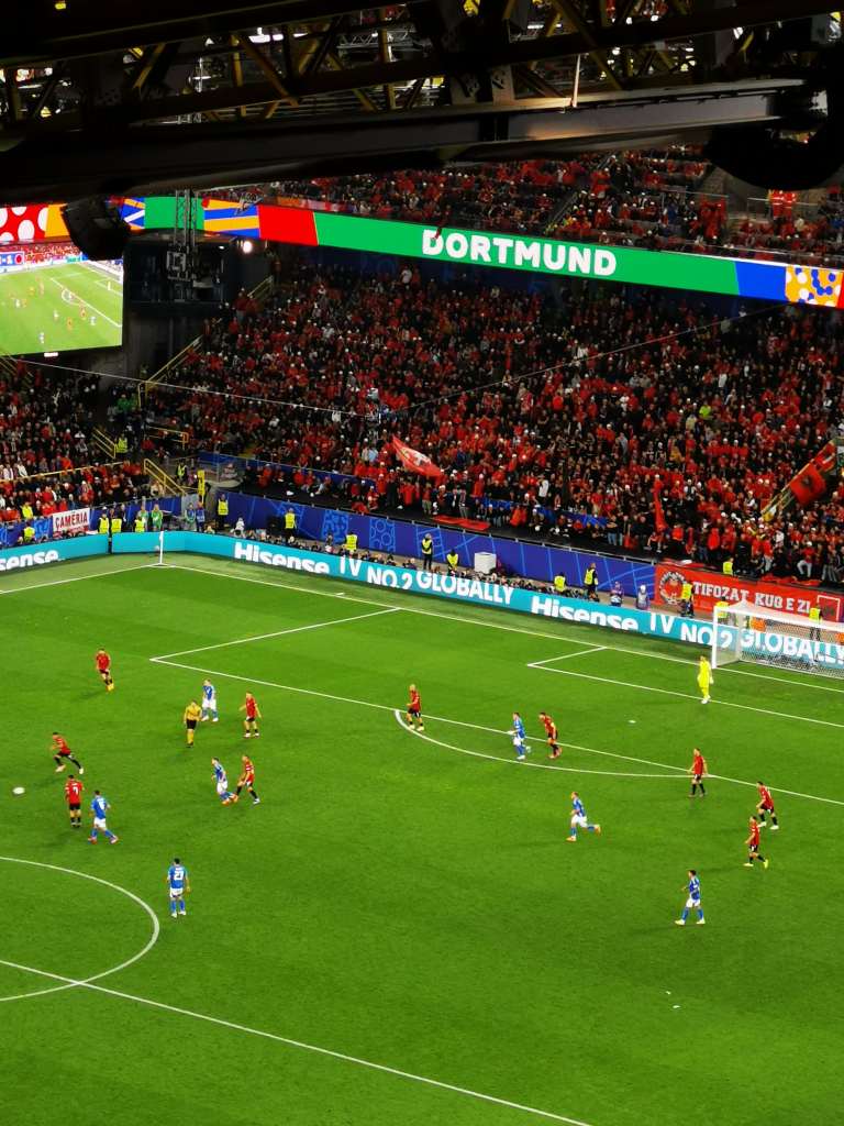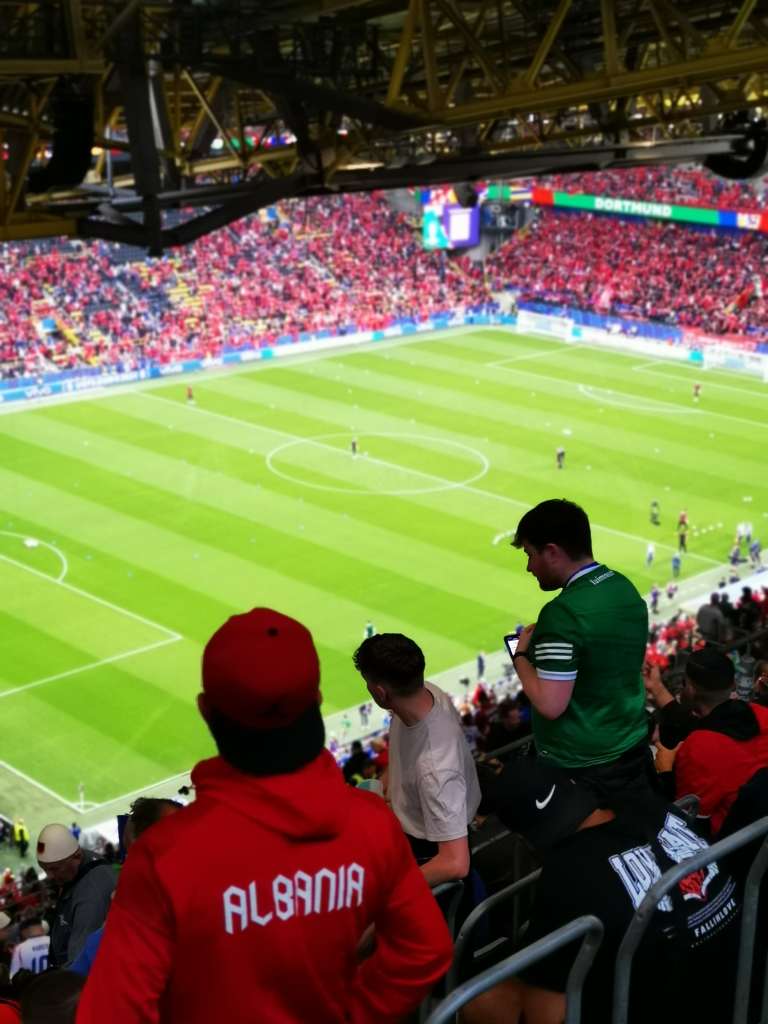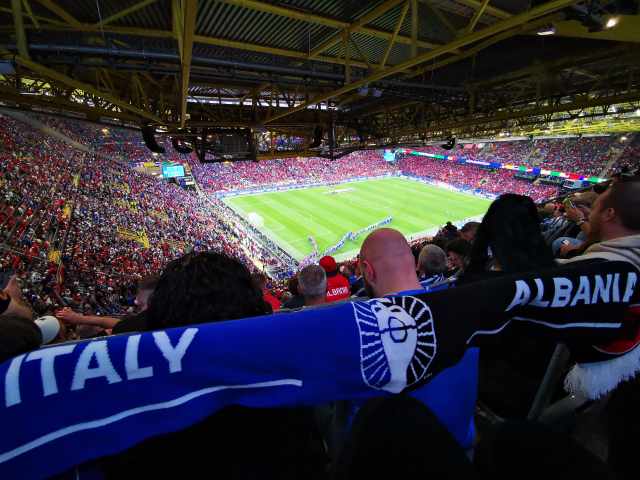 Dortmund 15.6.2024 klo 20.00. Stadionilla. Meidän paikkamme on Borussia Dortmundin kuuluisan Keltaisen seinän sivulla, lähes ylärivillä katsomossa 88. Albaaneilla oli ylivoima kaduilla sekä katsomossa ja lämmittelemään tulevat italialaiset saivat kokea sen suuren vihellyskonsertin muodossa. Ostimme 10 euron hintaiset (-kolmen euron pantti) tuopit katsomoon ja menimme takaisin paikoillemme varttia ennen ottelun alkua. Alkushow käyntriin, joukkueet kentälle, aloitusvihellys. Ja maali! Mitä ihmettä, ottelua ei ole pelattu kuin 22 sekuntia, kun Albania siirtyy 1-0 johtoon Italian sivurajaheiton jälkeen, kun Nedim Bajrami painaa pallon komeasti etuylänurkkaan. Käsittämätön alku pelille ja tuntuu kuin kaikki katsojatkaan eivät olisi sisäistäneet mitä juuri tapahtui. Täysin kiimaiset 50 000 albanialaista juhlii katsomossa kuin maa olisi juuri voittanut MM-kisat.