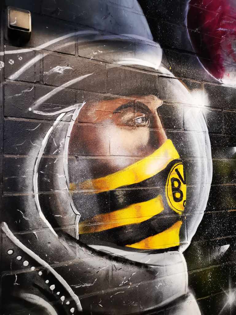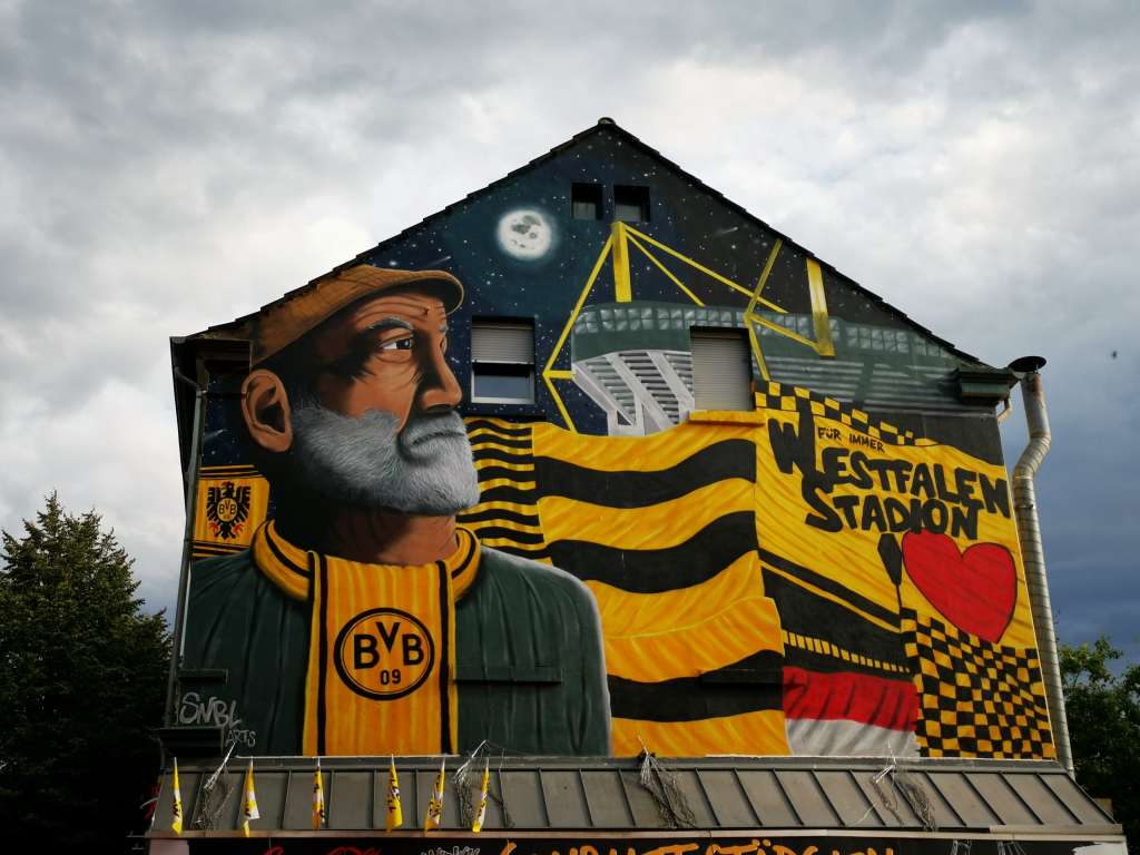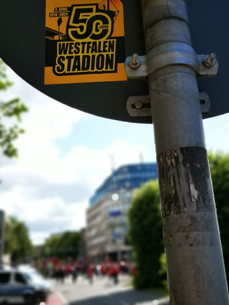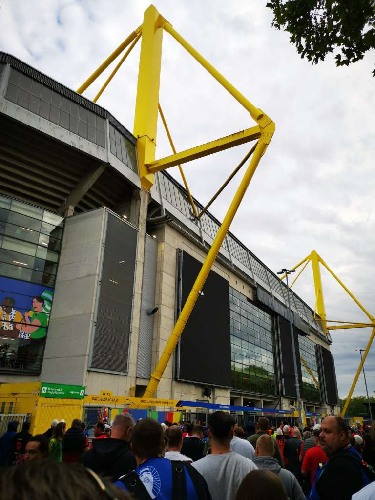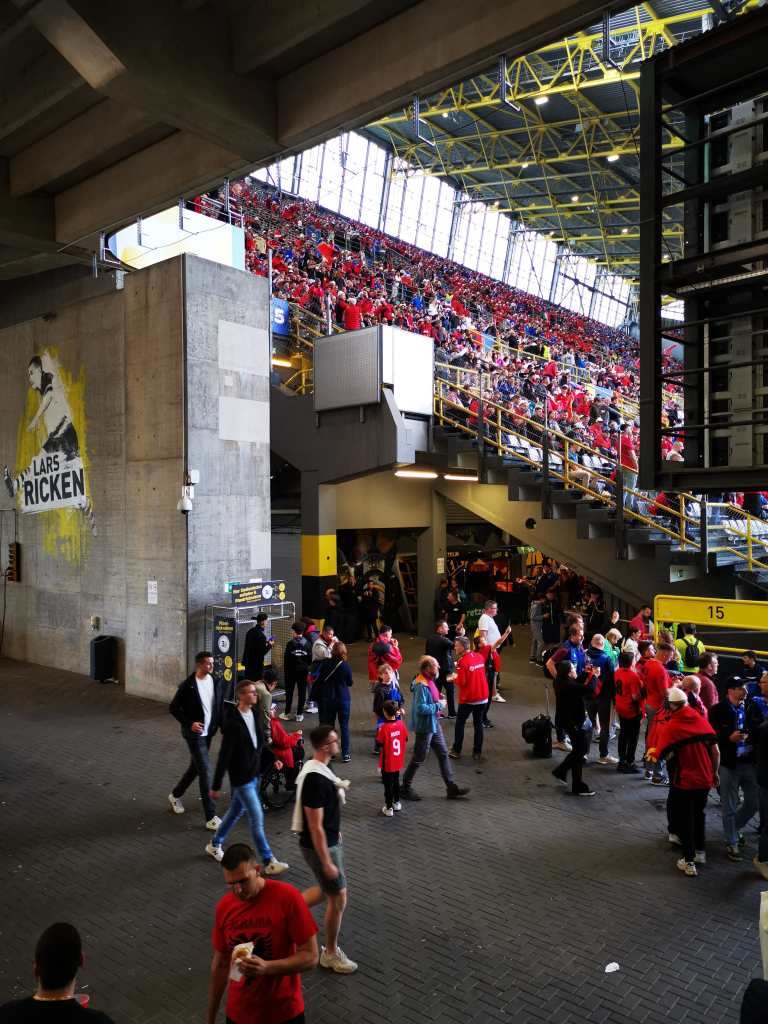 Seurasimme punaista ihmisvirtaa, joka vaelsi kaupunkiin pitkin kisoja varten asennettua vihreää, futiskentän nurmea muistuttavaa mattoa. Mattoa seuraamalla pääsi päärautatieasemalta suoraan stadionille. Kätevää, saa olla aika jurrissa, että tuossa olisi eksynyt. 20 minuutin kuluttua se oli siinä; legendaarinen Westfalenstadion ja sen keltaiset korkeuksiin nousevat mastot, jotka olimme bonganneet jo edellisiltana lentokoneesta. Olimme yhdellä aiemmalla reissulla käyneet katsomassa BVB:n kotipelin Mainzia vastaan. Sieltä ei muistot olleet ihan parhaimmat, sillä ottelussa katsomoon kuoli kotijoukkueen iäkäs kannattaja. Tällä kertaa toivoimme ottelulle onnellisempaa loppua. Turvatarkistus sekä lippujen tsekkaaminen meni kohtalaisen kivuttomasti ja olimme sisällä noin tuntia ennen matsin alkua.