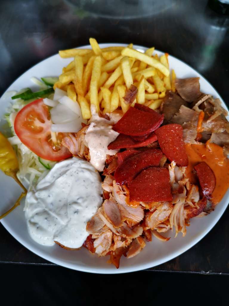 Matkaa Dortmundin kuuluisalle BVB Arena Dortmundille, joka myös Westfalenstadionina sekä Signal Iduna Parkina tunnetaan, on muutama kilometri. Jottei syömishommat pääse unohtumaan, niin matkanjärjestämisvastuun tällä kertaa saanut Mailapoika oli bongannut erinomaisen kebbemestan matkan varrelta. Sen tosin olivat bonganneet noin sata muutakin ihmistä, mutta 45 minuutin jonottelun jälkeen meidän edessämme oli kaupungin parhaat döner tellerit. Ai että.