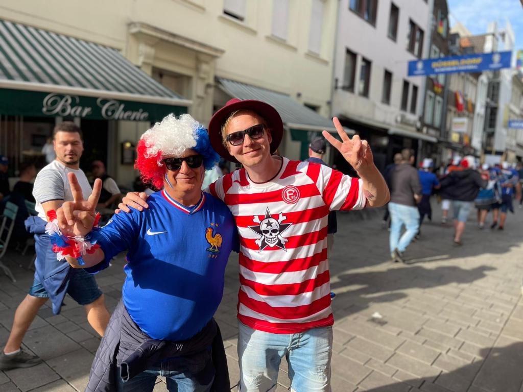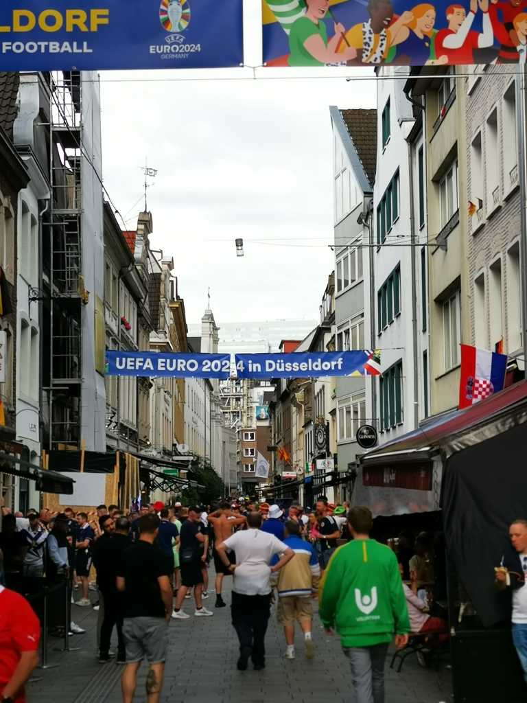 Düsseldorf maanantai 17.6.2024. Neljän hengen rytmiryhmämme oli nähtyt jo kaksi ottelua EM-futista, Italia – Albania Dortmundissa ja Serbia – Englanti Gelsenkirchenissä. Meillä oli toivelistalla myös lippu välipäivän Itävalta – Ranska otteluun, mutta onnetar ei ollut puolellamme, joten vietimme hauskan kaupunkipäivän Düsseldorfissa seuraten itävaltalaisten, ranskalaisten sekä kaupunkiin suurella määrällä saapuneiden skotlantilaisten menoa. Etenkin itävaltalaisten ja skottien meininki oli huikeaa eikä edes ajoittainen vesisade haitannut juurikaan.