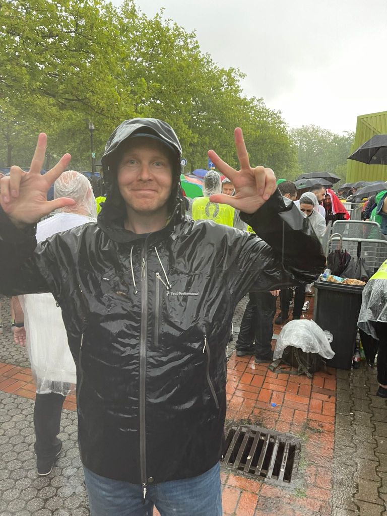 Dortmund 18.6.2024 klo 16:30. Peliin on puolitoista tuntia kun päätämme lähteä kohti stadionia. Matkaa ei ole kuin 500 metriä, mutta juuri kun olemme päässeet liikkeelle taivas repeää. Vettä tulee aivan helvetisti ja vaikka päälläni on goretex-takki, tuntuu että sekin vuotaa. Parissa minuutissa jalassa olevat Converset ovat läpimärät, farkut samoin boksereita myöten. Meillä sentään on sadetakit messissä toisin kuin lähes kaikilla muilla, mutta nyt on jo selvää, ettei kengät tai housut kuivu ennen huomista. Portilla avaan puhelimen ja näytän lipun koneelle, mutta vettä sataa niin paljon ettei näyttö toimi. Great. Lopulta saan puhelimen kuivattua ja suojattua niin, että portit aukeavat. Huh!