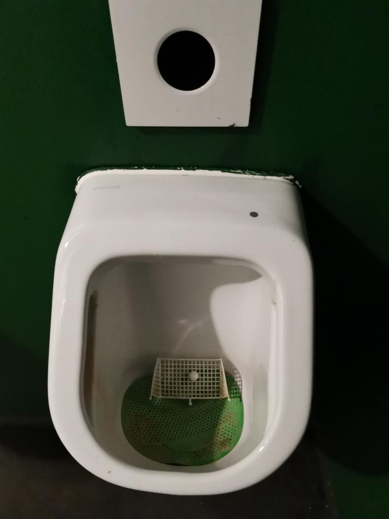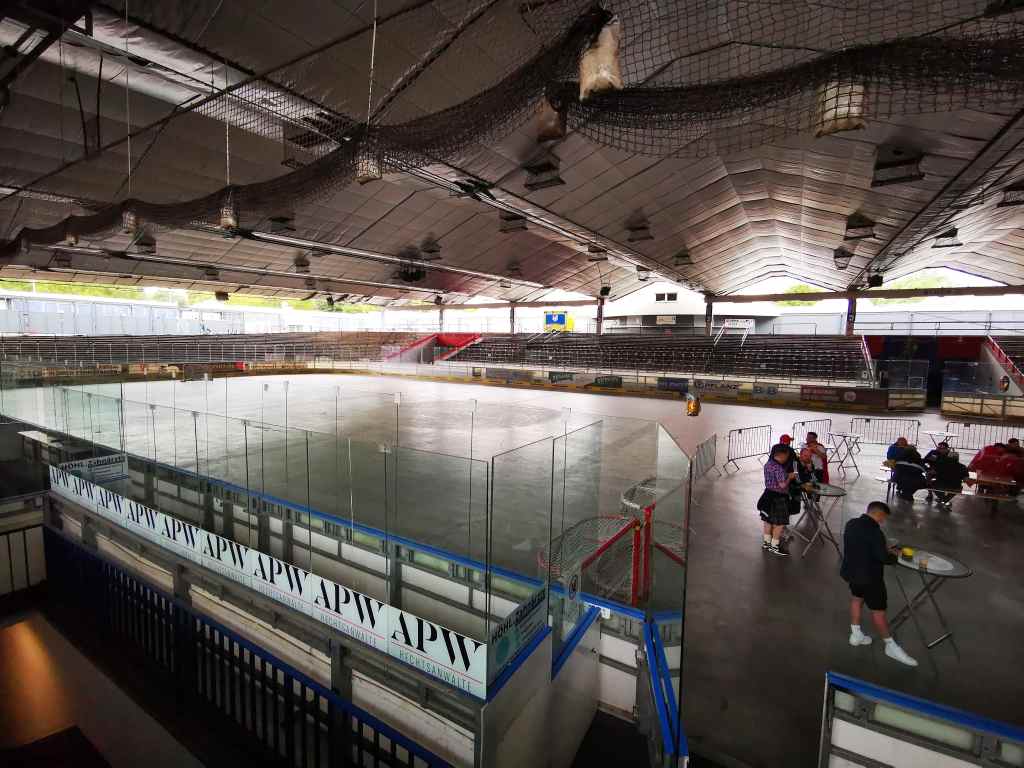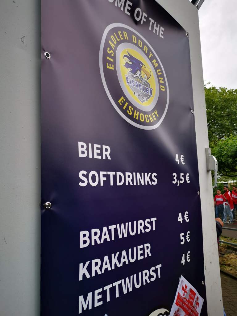 Sade lakkaa hetkeksi, joten jatkamme matkaa ja päätämme pistäytyä vielä lutuurisessa Dortmundin jäähallissa, jossa paikallinen jääkiekkoseura on avannut kaljamyyntipisteen ja screenin. Sopuisaan neljän euron hintaan löytyvät oluet maistuu, samalla kun screeni näyttää edellisen päivän pelien uusintoja. Halli on tuulahdus menneestä. Kaksi neljästä seinästä on auki ja seisomakatsomot kiertävät hallin ympäri, lukuunottamatta päädyn pientä VIP-penkkiriviä. Tänne olisi hieno tulla katsomaan alasarjalätkää jonkin futisreissun yhteydessä. Sisään tulee koko ajan enemmän ja enemmän porukkaa, sillä sade on alkanut uudestaan. Alamme kaivelemaan sadetakkeja tietämättä mitä vielä on edessä.