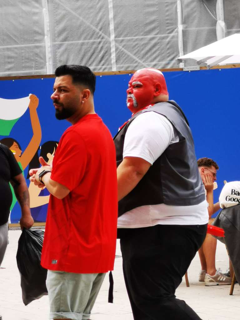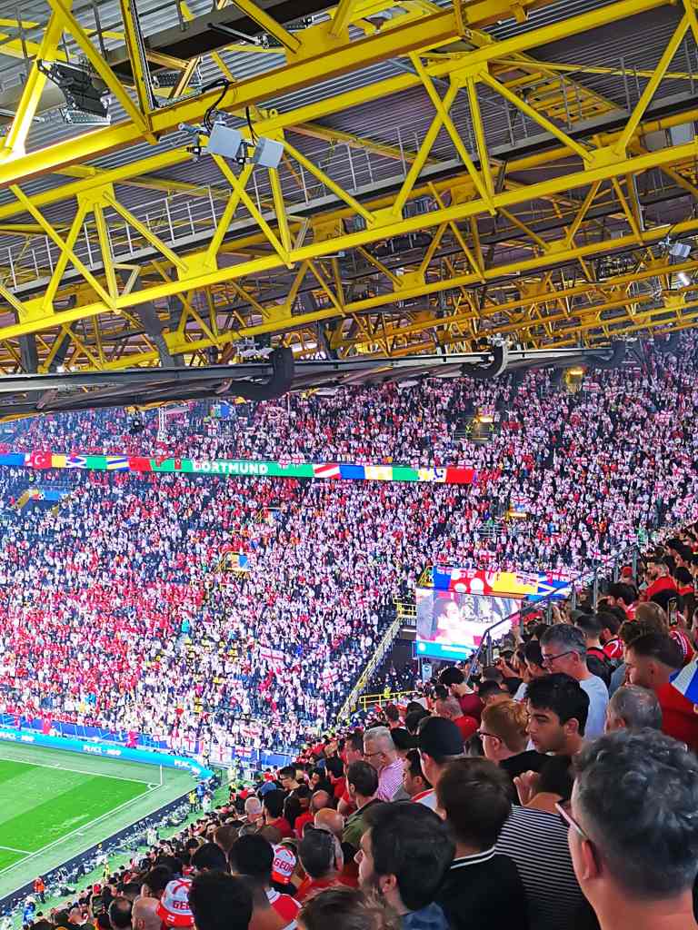 Dortmund 18.6.2024 kello 12. Düsseldorfissa tai junassa turkkilaisia ei näkynyt normaalimäärää enempää, mutta Dortmundissa tilanne oli toinen. Ehkä sata georgialaista availee äänijänteitään aseman edessä samalla, kun turkkilaisia on kuin kebabravintoita – joka kulmalla. Pelin alkuun on vielä kuusi tuntia aikaa, joten kävelemme lähemmäs keskustaa ja istahdamme ansaitulle oluelle. Tai no, parille. Pikku hiljaa ihmisiä vaeltaa vihreää mattoa kohti stadionia enemmän ja enemmän. Silmämääräisesti turkkilaisia on vähintään 80 prosenttia, mutta mitään ladimaista karnevaalitunnelmaa hassunhauskoineen pelleilyineen ei Dortmundin tiistaipäivässä ole.