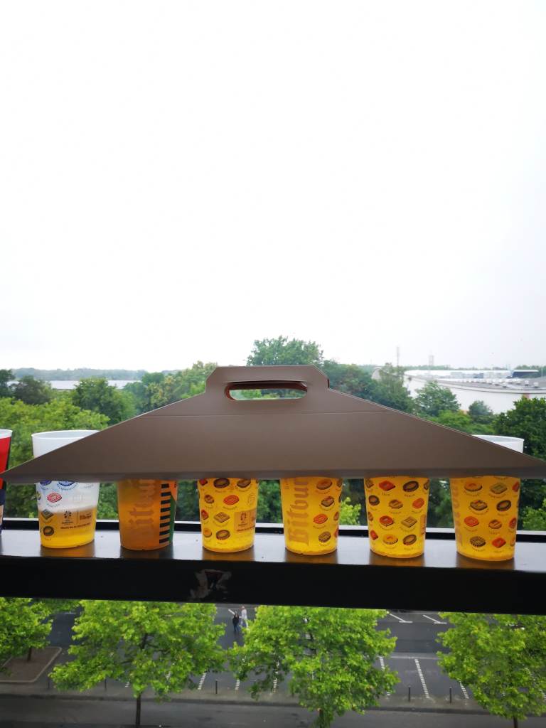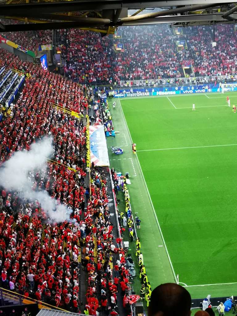 Düsseldorf tiistaina 18.6.2024 kello 10. Koko maanantai oli mennyt vähintäänkin vauhdikkaasti ympäri Düsseldorfia, joten herätys tiistai-aamuna oli sopivan rapsakka. Toimivaksi huomatun suihku- kermalikööri-aamupala -kombon jälkeen olikin jo hymy sekä olut huulilla, ja pian myös juna alla kohti Dortmundia. Düsseldorfin asemalla kävi samanlainen kuhina kuin muinakin päivinä, kun futisturistit sekä normimatkustajat etsivät oikeita laitureita, josta suunnata seuraavaan kohteeseen. Nyt ei ollut high risk-matsia lähettyvillä, minkä vuoksi poliisien määrä oli puolittunut siihen mitä esimerkiksi Englannin pelin alla oli, ja tunnelma oli muutenkin rauhallinen. Georgialaislippuja ja pelipaitoja näkyi kohtalaisen paljon, mutta turkkilaisia ei niinkään. Matkalla Dortmundiin juna pysähtelee tutuissa futiskaupungeissa; Duisburgissa, Bochumissa sekä Essenissä. Näistä jälkimmäinen on vielä bongaamatta, mutta ehkä Rot-Weiss Essenin stadionkin kutsuu pian.