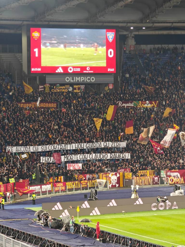 Ottelu alkaa. Roma pitää palloa enemmän ja hallitsee kenttätapahtumia. Leccen loistava kannattajakulmaus haastaa kotipäätyä tosissaan ja tunnelma Rooman illassa on erinomainen. Tunnelma vain paranee, kun AS Roma siirtyy 1-0 johtoon belgialaisen, pitkään Italiassa pelanneen, Alexis Saelemaekersin tuikattua pallon sisään ottelun 13 minuutilla. AS Roma johtaa ensimmäistä kertaa pappa-Ranierin alaisuudessa. Mutta ei johda kovin kauaa, sillä Leccen nopea vastahyökkäys ottelun 40 minuutilla päättyy siihen, kun pelaajaa rikotaan kuudentoista alueella. Tuomari ei kauaa mieti vaan näyttää pallon pilkulle. Nikola Krstovic ampuu pallon kylmästi oikeaan yläkulmaan ja tasoittaa matsin 1-1:een. Päät painuvat myös ympärillä katsomossa, taasko tässä käy näin? Näissä lukemissa siirryttiin myös tauolle.