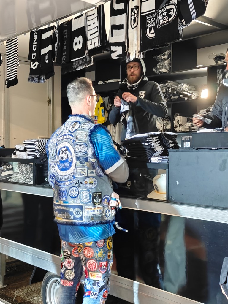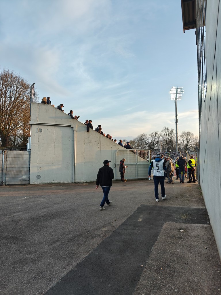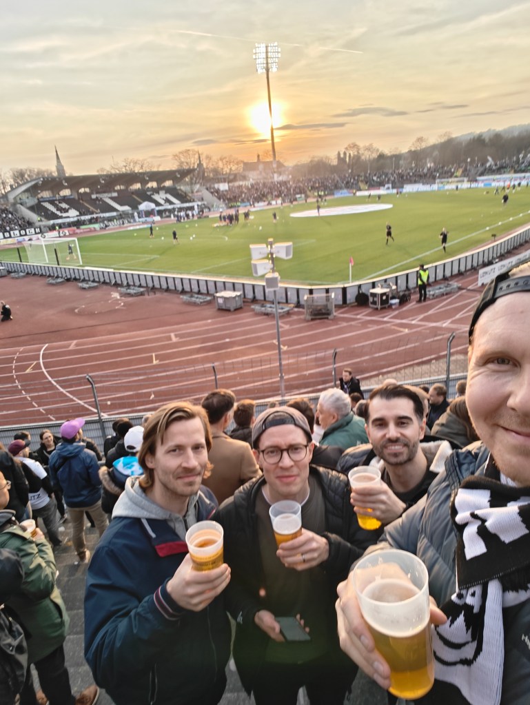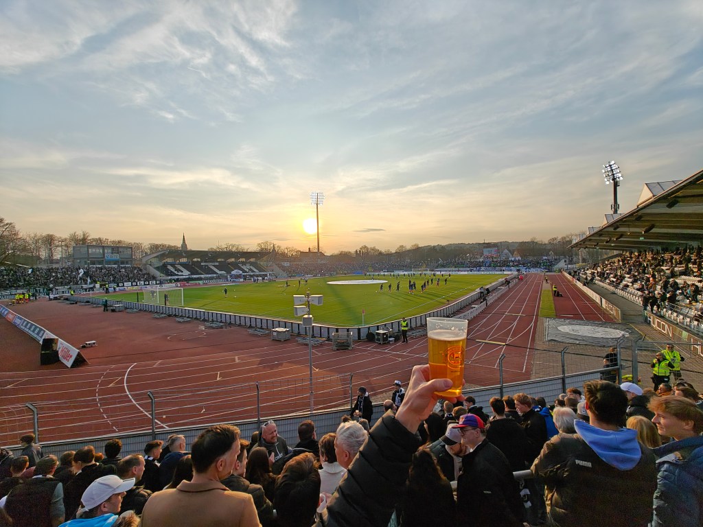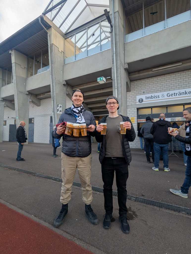 Tunnelma on hyvä. Ultrat pitävät molemmissa päissä jatkuvaa ääntä ja välillä myös muut katsomonosat osallistuvat laulamiseen. Ei tätä voi ehkä verrata Saksan kaikista lutuurisimpiin paikkoihin, mutta viihdymme, vaikka peli on kohtalaisen tylsää. Onneksi sentään tarjoilu pelaa ja koska olemme janoisia suomalaisia, niin ostamme kuuden tuopin pahvisen kantotelineen, jonka pantti on yllättäen viisi euroa. Kallista pahvia, mutta ainakin ekologista, kun roskaa ei jätetä lojumaan katsomoon. Itse 0,4 litran olut stadionilla maksaa 4,50 plus kahden euron pantti, mutta koska Saksa ja nykyteknologia ei vielä vuonna 2025 mahdu samaan lauseeseen, niin lähikiskassa maksutavaksi käy vain käteinen. Onneksi olemme valmistautuneet tähänkin.