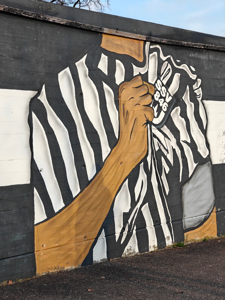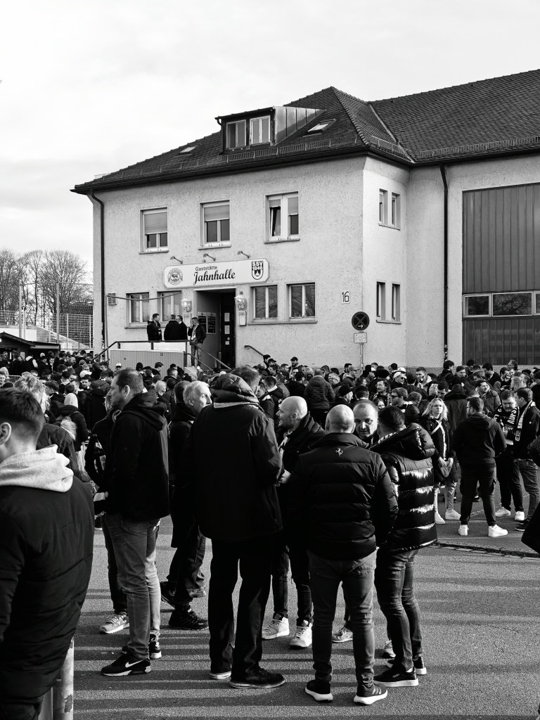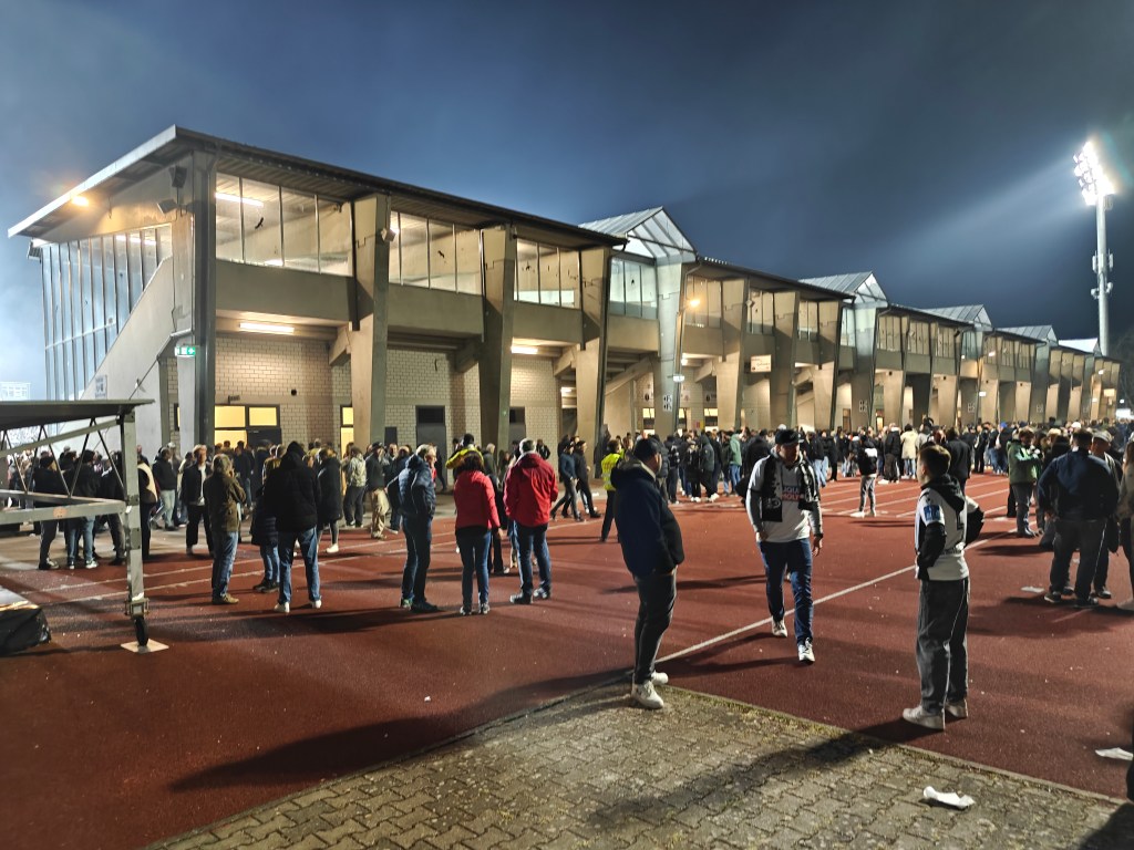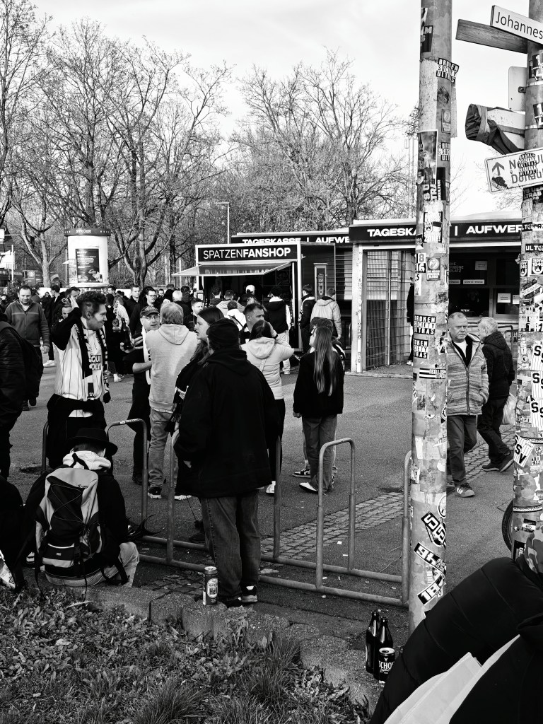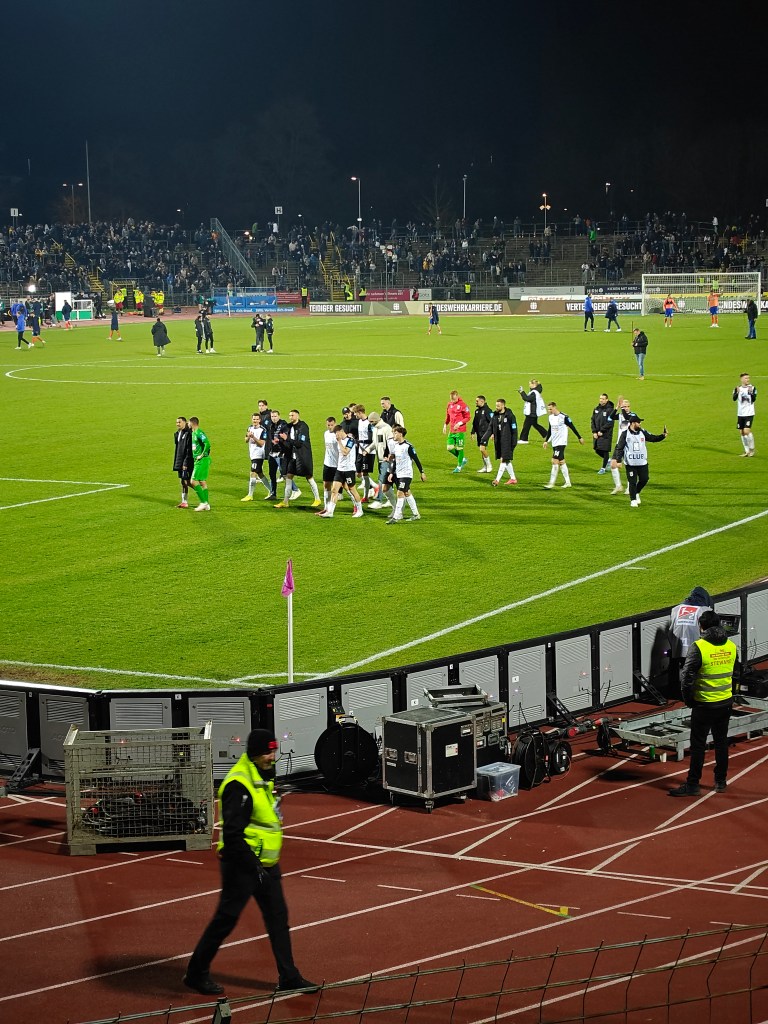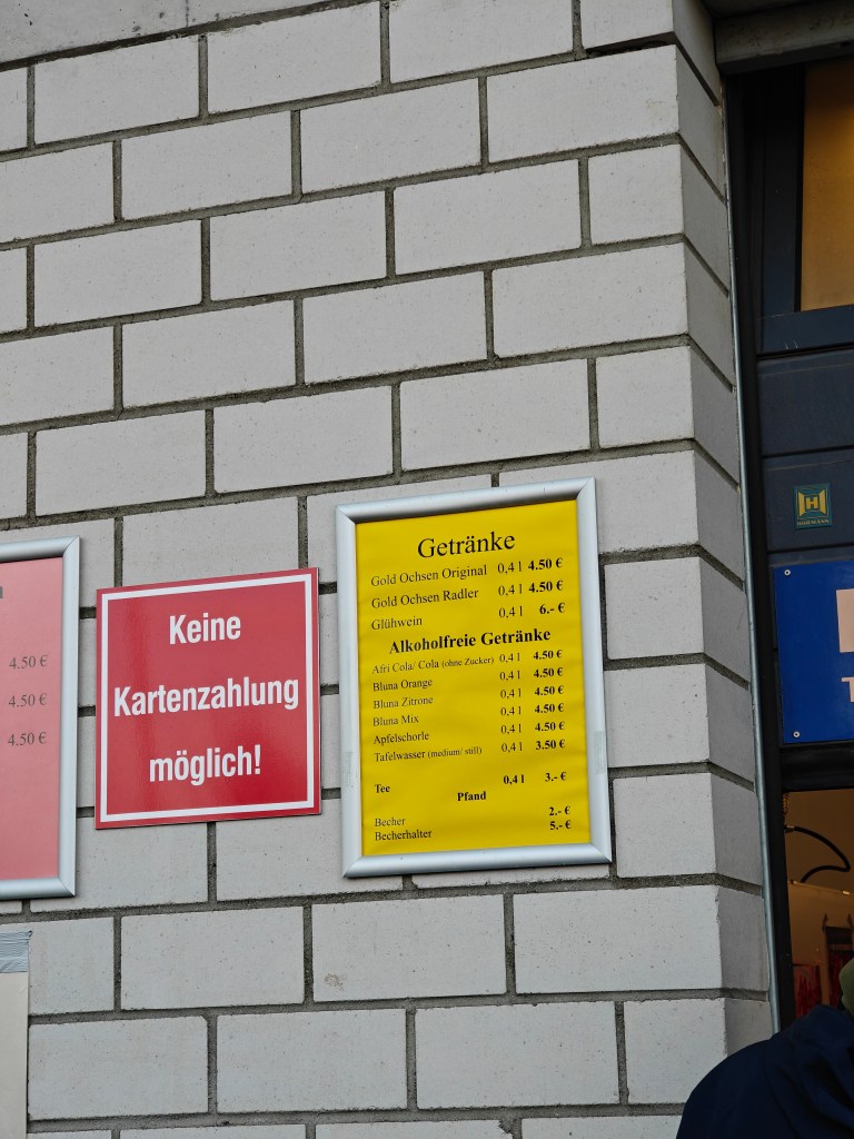 Tunnelma on hyvä. Ultrat pitävät molemmissa päissä jatkuvaa ääntä ja välillä myös muut katsomonosat osallistuvat laulamiseen. Ei tätä voi ehkä verrata Saksan kaikista lutuurisimpiin paikkoihin, mutta viihdymme, vaikka peli on kohtalaisen tylsää. Onneksi sentään tarjoilu pelaa ja koska olemme janoisia suomalaisia, niin ostamme kuuden tuopin pahvisen kantotelineen, jonka pantti on yllättäen viisi euroa. Kallista pahvia, mutta ainakin ekologista, kun roskaa ei jätetä lojumaan katsomoon. Itse 0,4 litran olut stadionilla maksaa 4,50 plus kahden euron pantti, mutta koska Saksa ja nykyteknologia ei vielä vuonna 2025 mahdu samaan lauseeseen, niin lähikiskassa maksutavaksi käy vain käteinen. Onneksi olemme valmistautuneet tähänkin.
