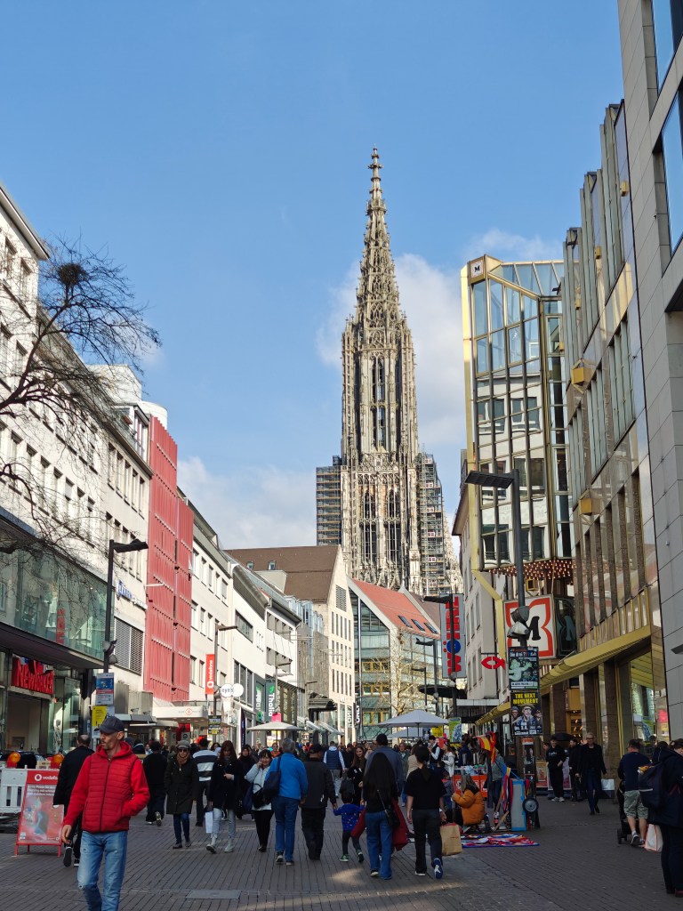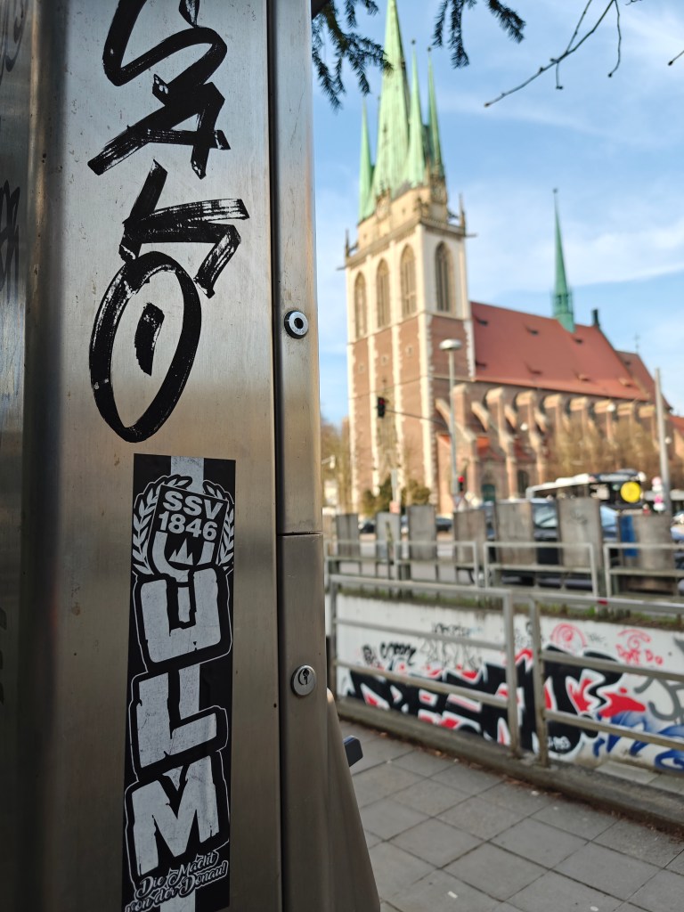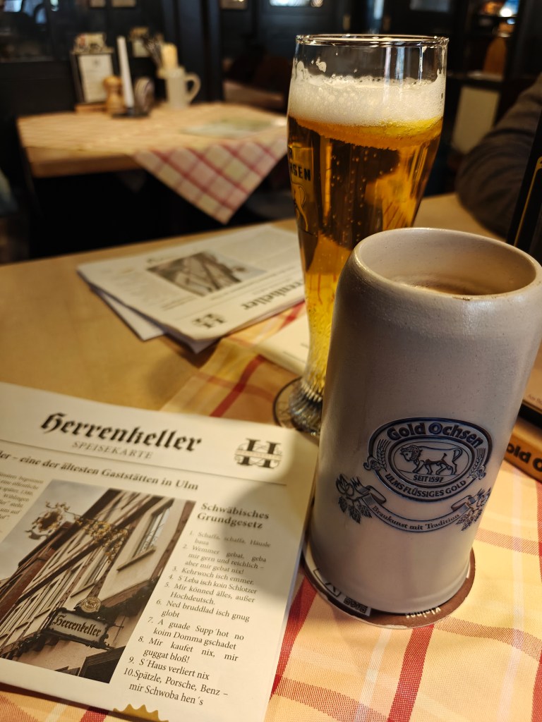 Ulm perjantai 28.3.2025 klo 15:30. Juna puksutteli epäsaksalaiseen tapaan suurin piirtein aikataulussa kohti Ulmia, tuota Baden-Württembergin osavaltiossa sijaitsevaa kaupunkia, jossa elelee vajaat 130 000 asukasta. Kaupunki sijaitsee Baden-Württembergin osavaltiossa Münchenin ja Stuttgartin puolivälissä noin puolentoista tunnin päässä molemmista suurkaupungeista. Matka taittui varsin viihtyisästi ravintolavaunussa, josta saimme vallattua oman loossin. Junasta ostettujen tuoppien sekaan saattoi livahtaa myös ennalta hankitut bisset, sillä lämpenemään niitä ei kannattanut päästää. Tunnelma. Se nousee.