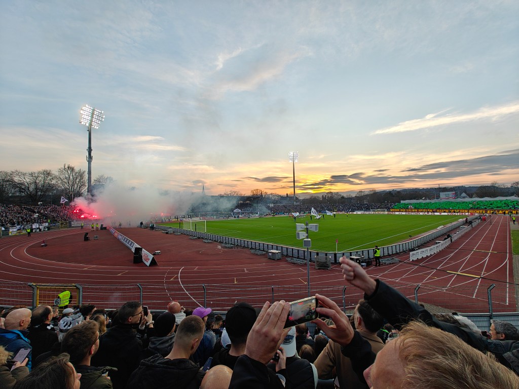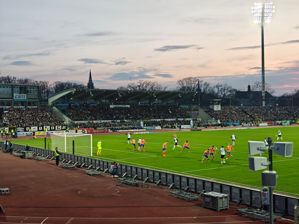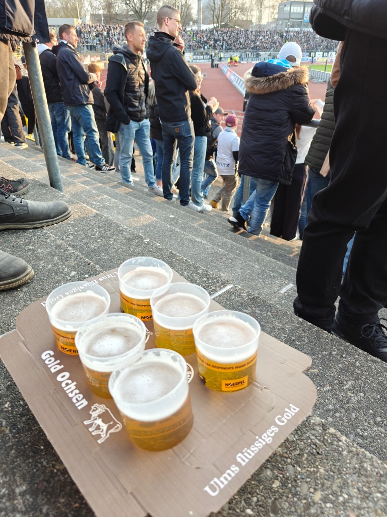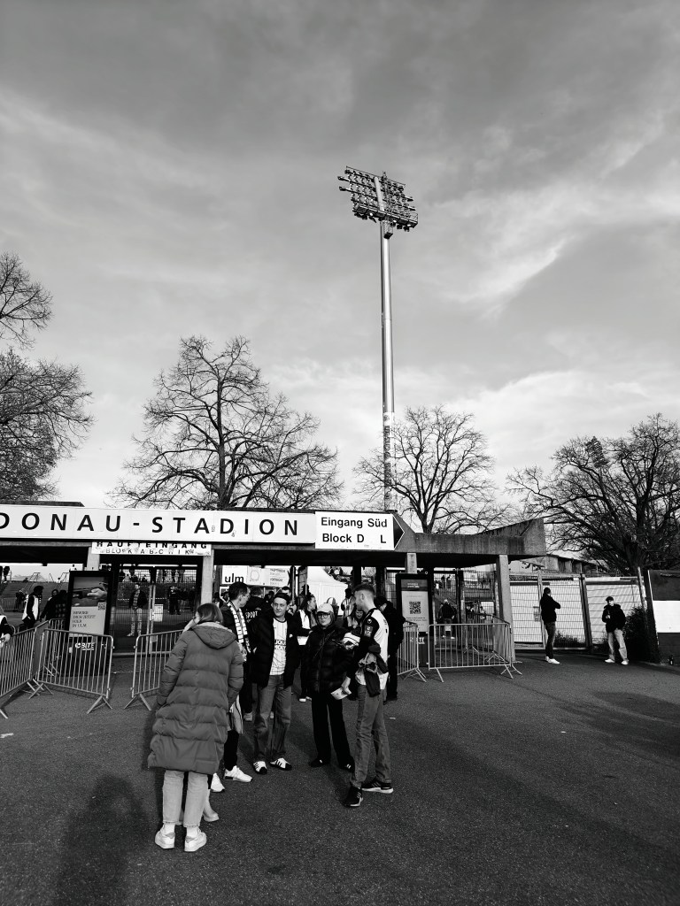 Ulm Donaustadion perjantai 28.3.2025 klo 17:30. Donaustadion eli Tovana-stadion on saaanut nimensä vieressä virtaavan joen mukaan. Se on rakennettu vuonna 1925 eli se täyttää tänä vuonna pyöreät 100 vuotta. Ihan samalla kentällä ja samoilla katsomoilla ei toki tällä hetkellä pelata, mutta sijainti sekä historia ei ole muuttunut mihinkään. Aikaisimmilla kausilla 3. Ligassa pelatessaan joukkue on joutunut talvikuukausina lähtemään evakkoon, koska stadion ei ole saanut pelilupaa jalkapalloliitolta. Tällä kaudella fasiliteetteja on parannettu, joten nyt Ulm saa nauttia kotikentästään koko kauden. Vahvasti kasarihenkinen stadion vetää reilut 17 000 katsojaa, joista seisomapaikkoja on 10 000. Kaudella 2024-2025 yleisökeskiarvo on ollut vähän yli 15 000, joka viitisen tuhatta enemmän kuin edelliskaudella 3. Ligassa. Ulm vetää siis yli 10 prosenttia kaupungin väestöstä pelipäivänä stadionille.