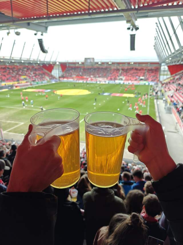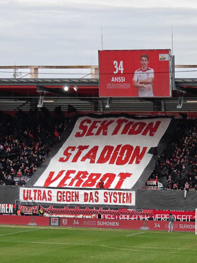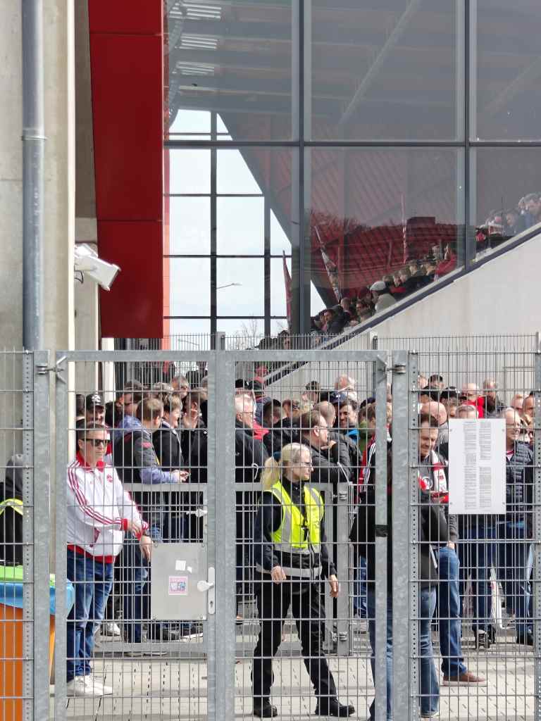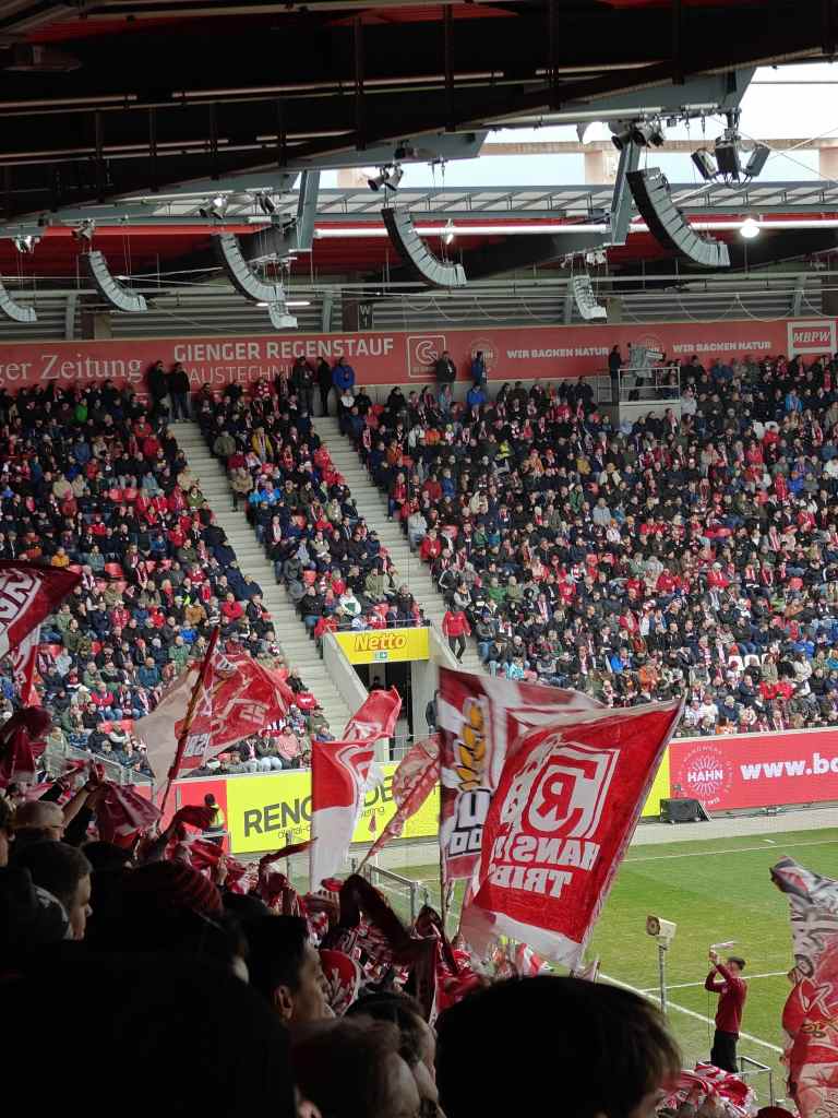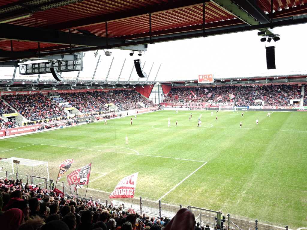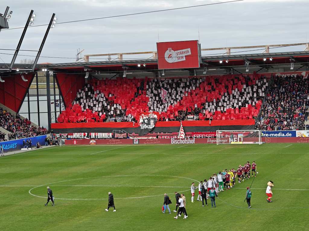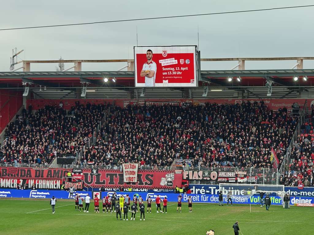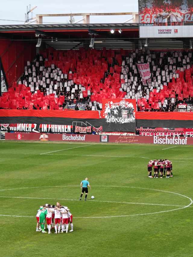 ”Wir sind die Fans, die Fans von Jahn Regensburg” Puolet päätykatsomosta pomppii mukana ja laulaa kannattajalaulua Peppi Pitkätossun sävelmän tahtiin. Kolmasosa pääsylipuista on mennyt vierasjoukkueen kannattajille ja se näkyy sekä kuuluu. Toinen pääty sekä osa sivukatsomoista on täysin Nürnbergin väreissä.