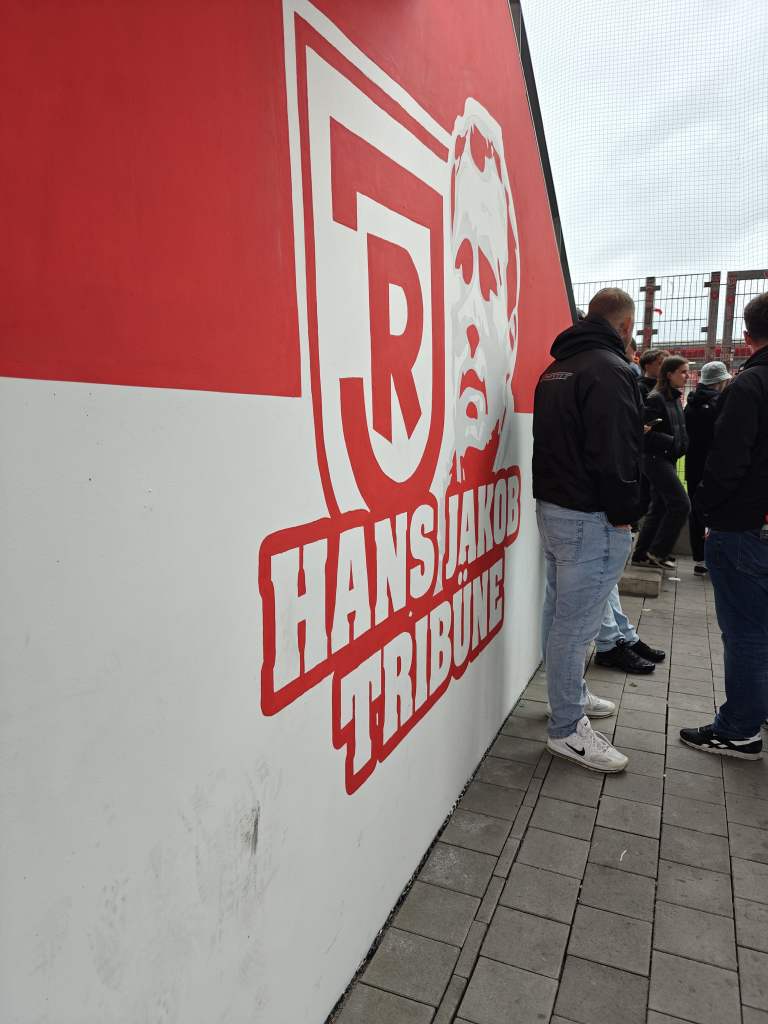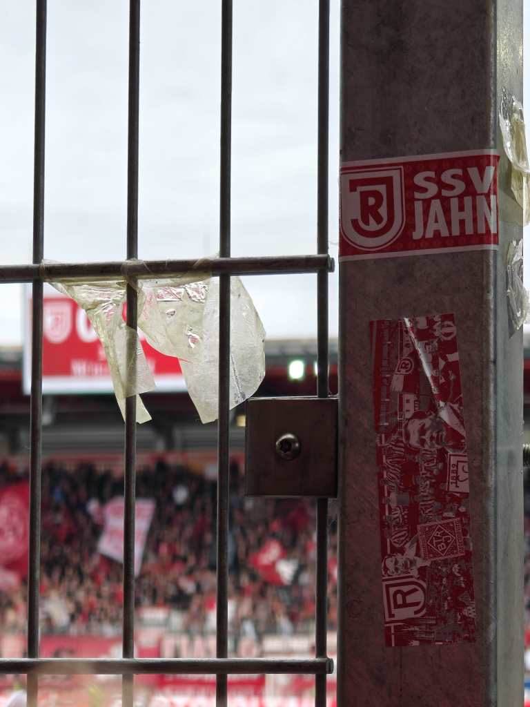 Hyppäämme aseman vierestä lähtevään shuttle-bussiin, joka vie meidät vartissa perille Jahnstadionille. Ihmettelemme hieman, kun bussi pysähtyy suoraan kymmenien Nürnberg-kannattajien bussin eteen, mutta suuntaamme siitä sitten muina miehinä kohti kotikannattajien katsomonosaa suurimman osan bussista olleista painellessa aidattua tietä pitkin vieraskatsomoon. Olimme FutisForum2:selta lukeneet, että Regensburgissa ei stadionbongarit ole kovin pidetty, joten haimme kotivärejä kaulaan ennen siirtymistä Jahnin kannattajapäätyyn.