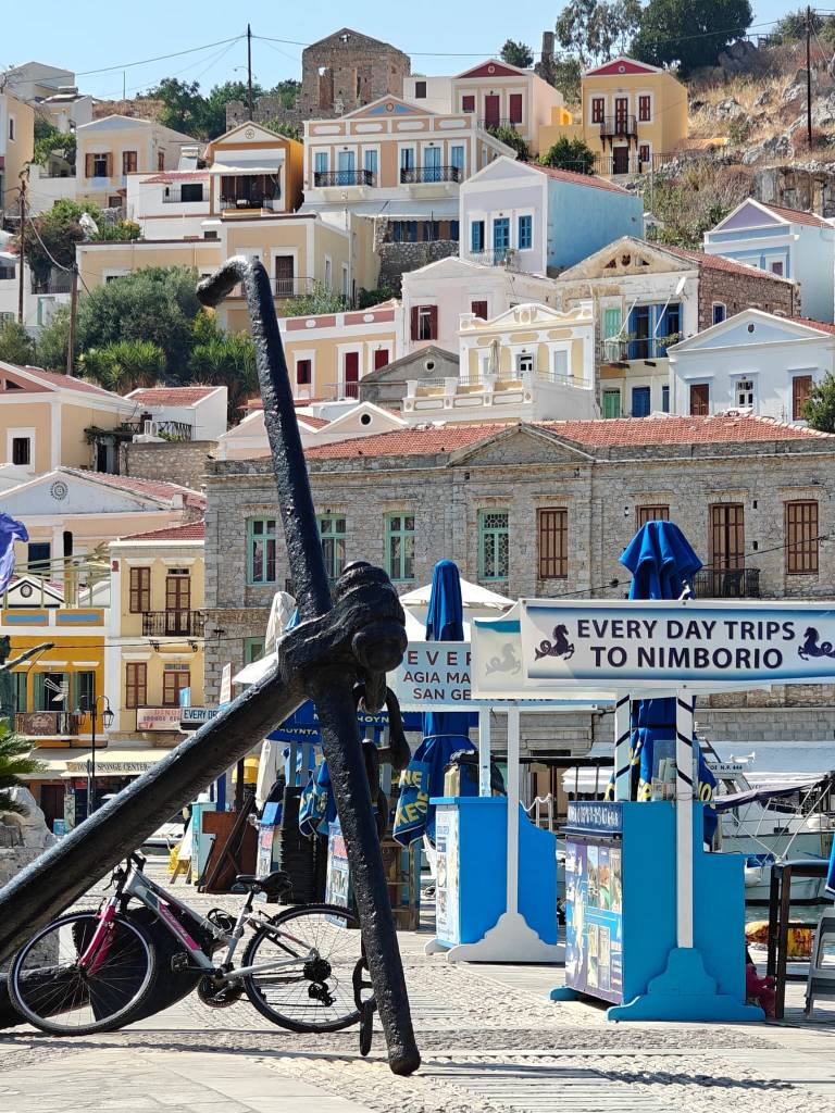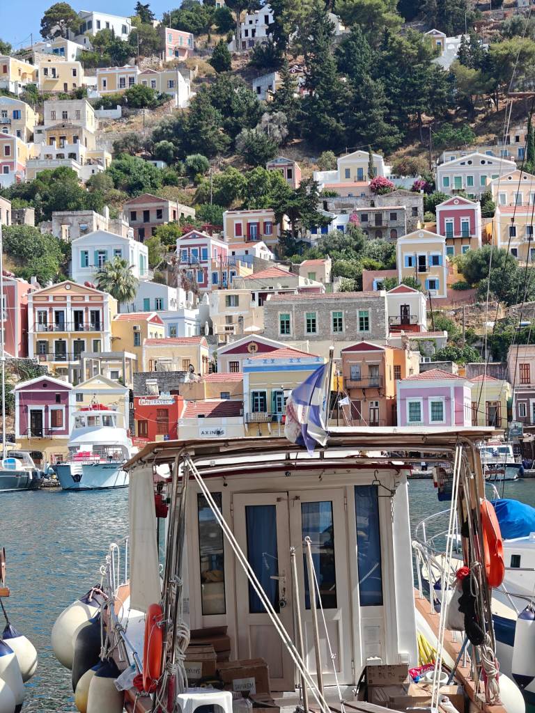 Symi on yksi kauneimmista saarista Kreikassa ja itselleni se oli ehdoton must see -juttu, kun Rodoksen matka varmistui. Poukamasta, johon laivat saapuvat avautuu upea näkymä vuoren rinteisiin rakennettuihin värikkäisiin taloihin. Samaan aikaan laituriin saapuu myös kaksi muuta lauttaa täynnä matkustajia, jolloin Symi näyttää sen huonon puolensa. Jäätävän turistikaaoksen.