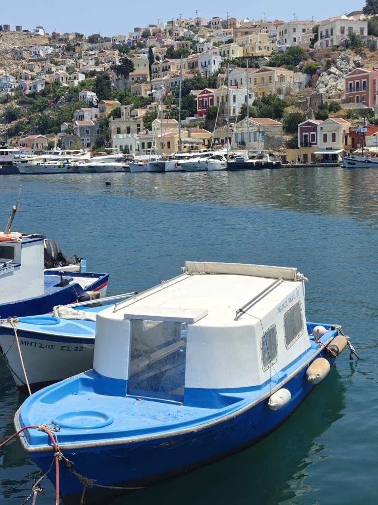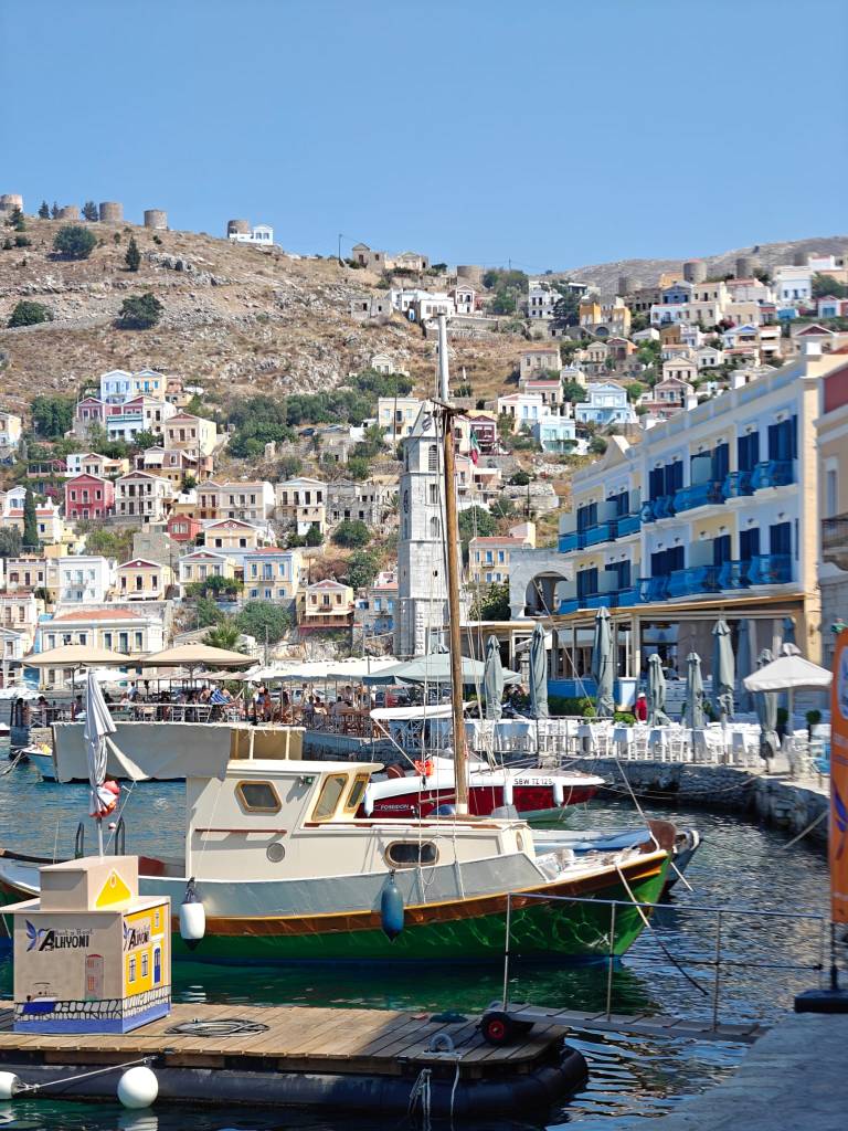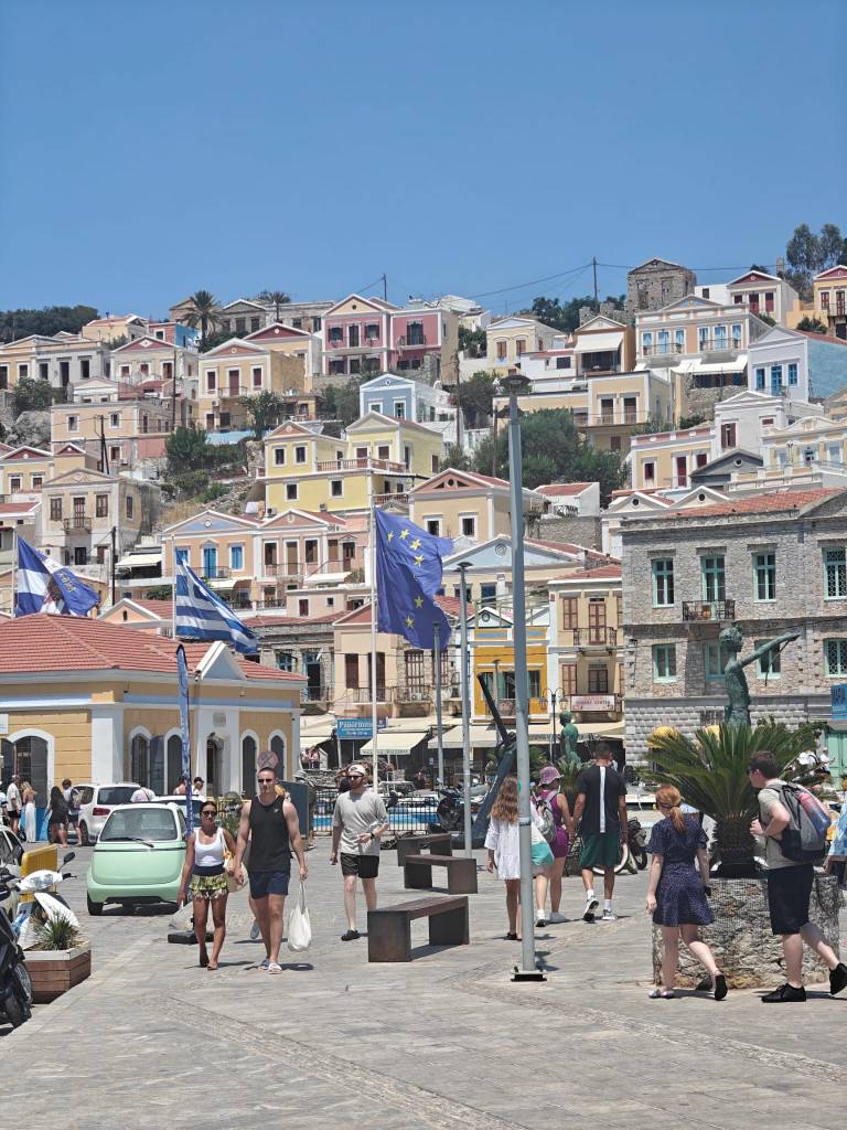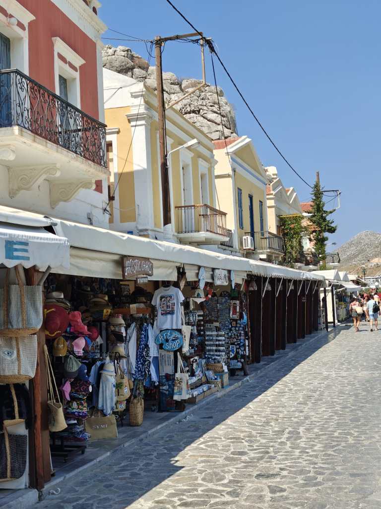 Satamäärin turisteja puikkelehtii kapeaa rantakatua pitkin. Välillä autot ja skootterit matelevat ohi ruuhkassa. Ensifiilikset saaresta ovat ristiriitaiset – maisemat ovat nautinnolliset, mutta kuumuus ihmisruuhkassa ei. Onneksi pian helpottaa ja lähdemme kiertämään pitkin Symin ”keskustan” pikkukatuja ravintolaa etsien. Nälkä on kova ja päädymme ensimmäiseen tavernaan, jossa on muutama pöytä vapaana. Virhe. Ruoka on kalliimpaa kuin Rodoksen saarella ja annoksetkin pienempiä. Palvelukin on kaikkea muuta kuin hyvää ja sama selviää myös Googlen arvioita lukiessa. Kiertäkää Taverna International kaukaa ja syökää muissa paikoissa, valinnanvaraa riittää. Ensimmäisen tunnin perusteella Symi ei ole sykähdyttänyt.