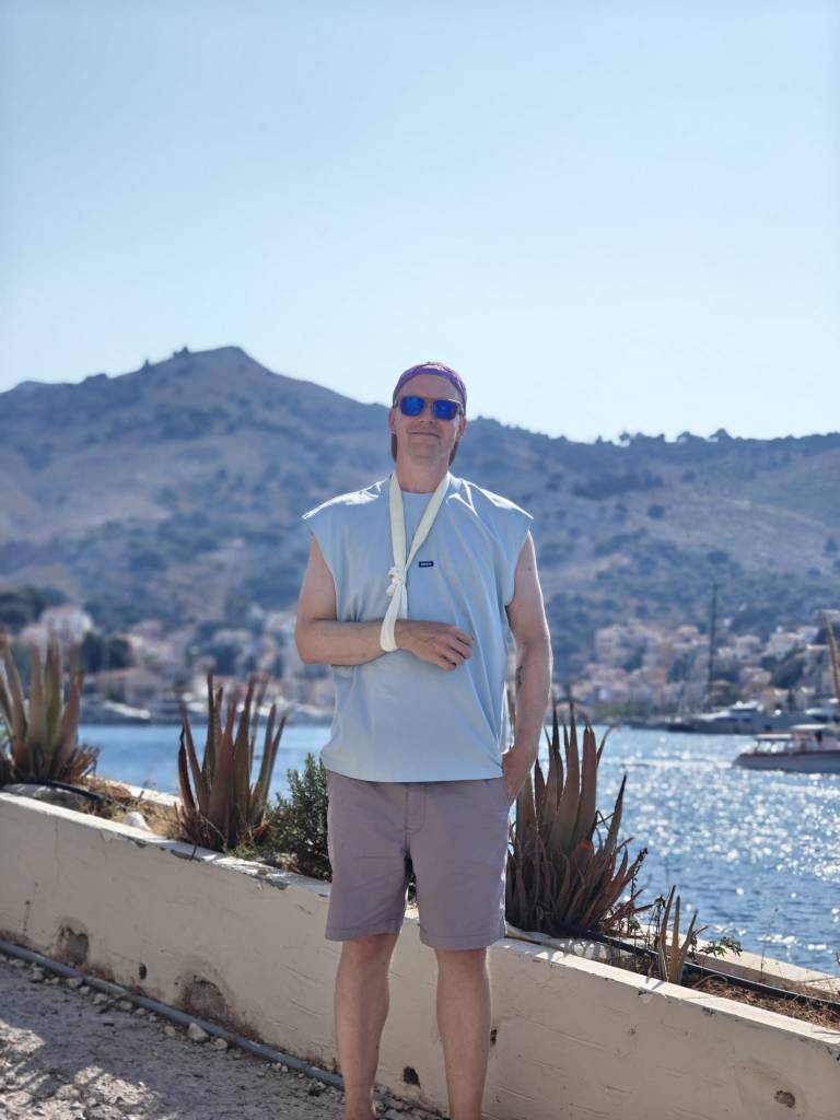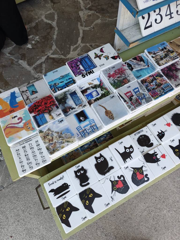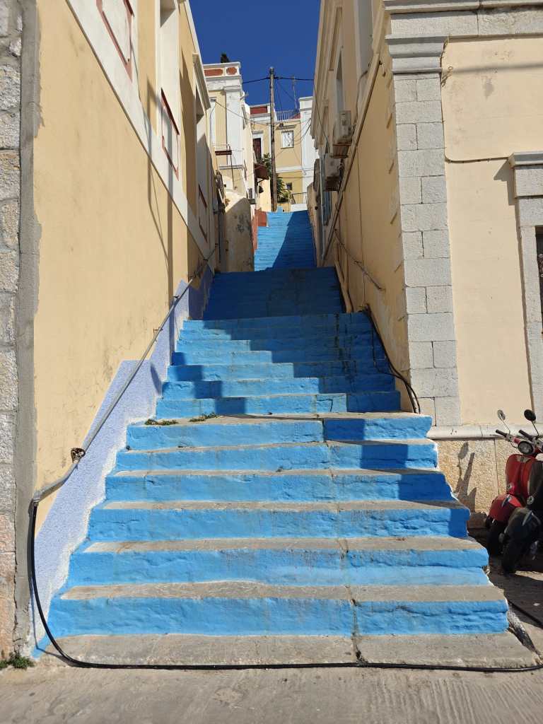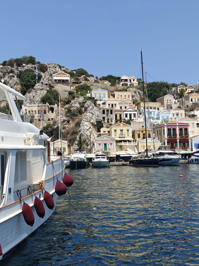 Satamäärin turisteja puikkelehtii kapeaa rantakatua pitkin. Välillä autot ja skootterit matelevat ohi ruuhkassa. Ensifiilikset saaresta ovat ristiriitaiset – maisemat ovat nautinnolliset, mutta kuumuus ihmisruuhkassa ei. Onneksi pian helpottaa ja lähdemme kiertämään pitkin Symin ”keskustan” pikkukatuja ravintolaa etsien. Nälkä on kova ja päädymme ensimmäiseen tavernaan, jossa on muutama pöytä vapaana. Virhe. Ruoka on kalliimpaa kuin Rodoksen saarella ja annoksetkin pienempiä. Palvelukin on kaikkea muuta kuin hyvää ja sama selviää myös Googlen arvioita lukiessa. Kiertäkää Taverna International kaukaa ja syökää muissa paikoissa, valinnanvaraa riittää. Ensimmäisen tunnin perusteella Symi ei ole sykähdyttänyt.