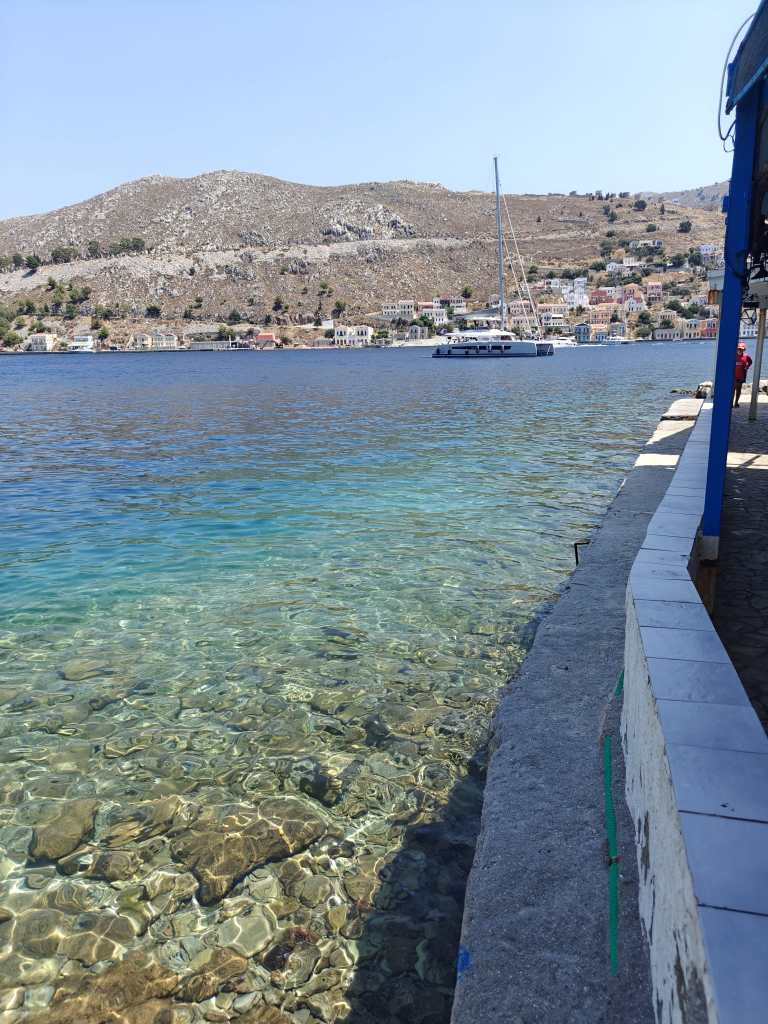 Meillä on vielä pari tuntia aikaa tuhlattavana paluulautan lähtöön, joten pysähdymme pariinkin kertaan kahville, mehuille ja jääkylmälle Mythos-tuopille 30 sentin päähän merestä. Postikorttimaista maisemaa katsellessa ymmärtää miksi Symi on niin suosittu kohde päivän tai parin reissulle. Eihän näiden maisemien katselemiseen voi kyllästyä. Vaikka ensifiilikset olivat hieman negatiiviset, niin muutamaa tuntia myöhemmin ne olivat nousseet reippaasti plussan puolelle. Voin vain kuvitella mikä paratiisi tämä olisi pahimman turistiajan ulkopuolella touko- tai syyskuussa.
