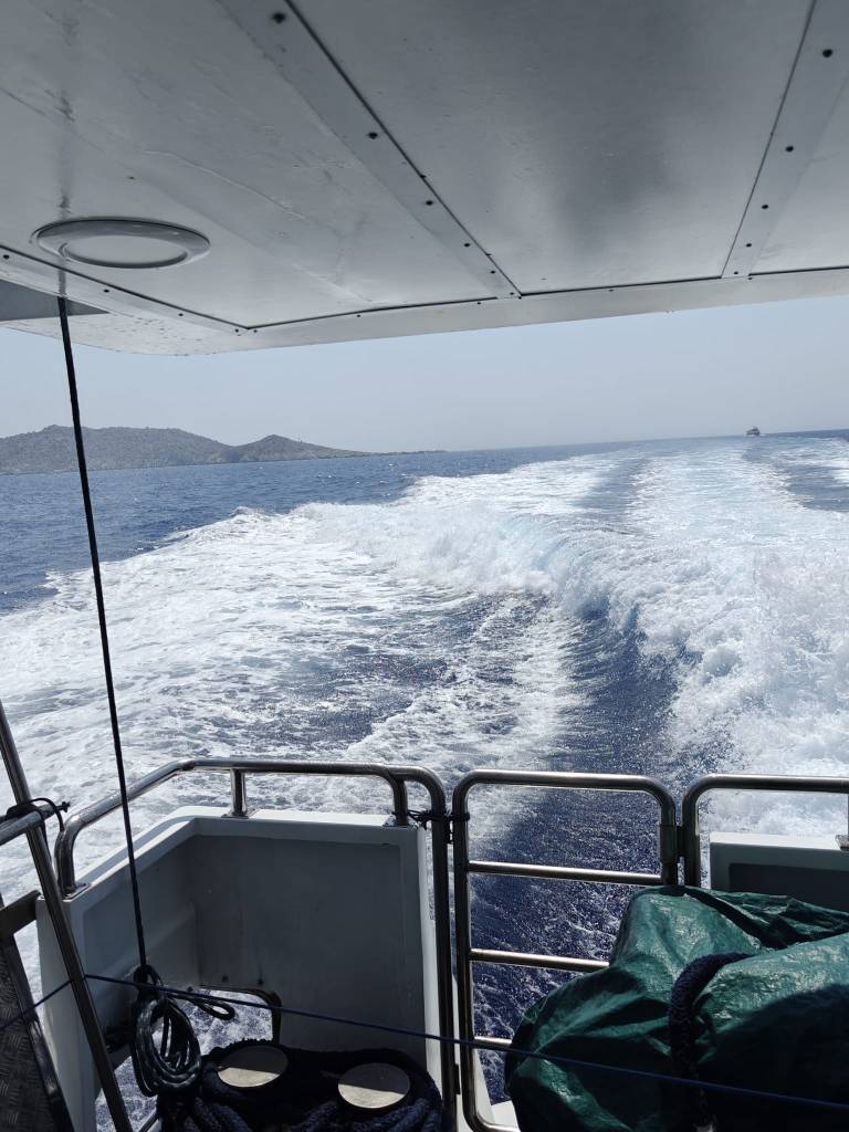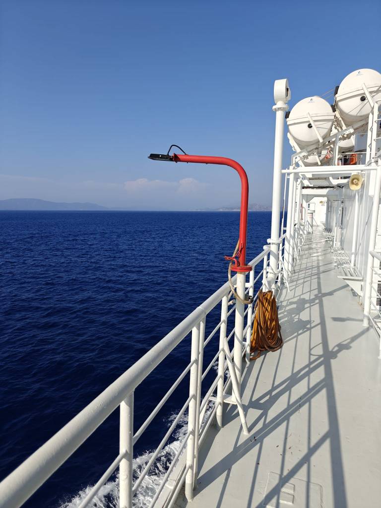 Merimatkalla Turkki nähdäänkin muutaman kymmenen metrin päästä ja taisipa lautta hetken Turkin merialueella ollakin, kun puhelimeen ilmestyi ”Tervetuloa Turkkiin”-viesti. Vaikkei merenkäynti tänään ole kovaa, pärskivät aallot lautan keulasta, niin, että yläkannella saattaa kastua. Se tosin vain virkistää yli 30 asteen helteessä. Puolentoista tunnin matka sujuu chillisti merimaisemia katsellessa, mutta voin kuvitella, että kovemmalla tuulella matka ei ole pelkkää nautintoa.