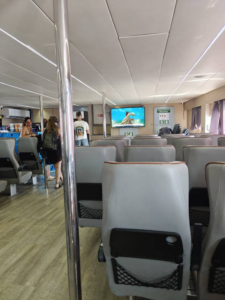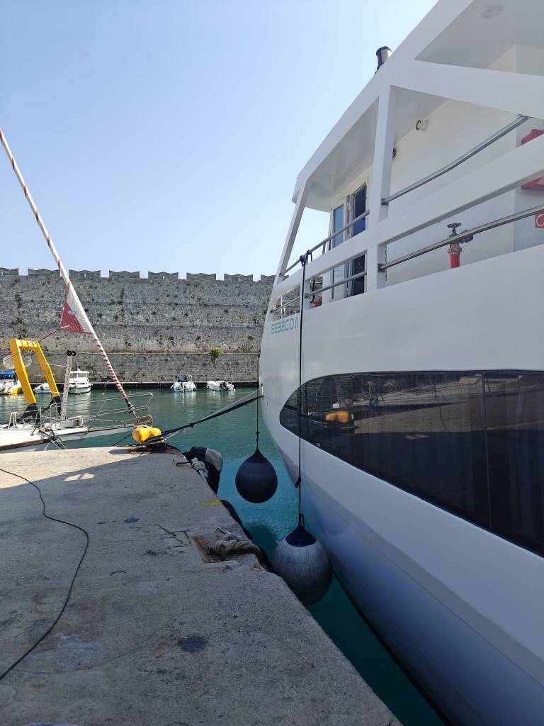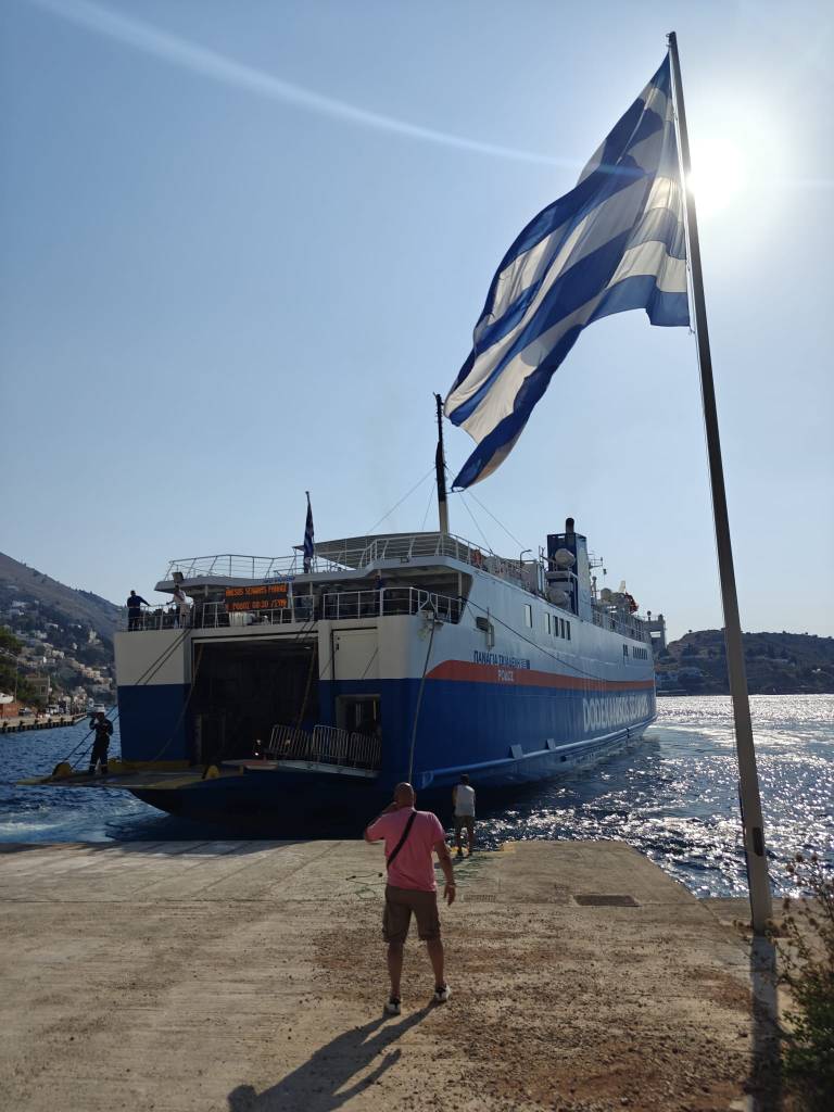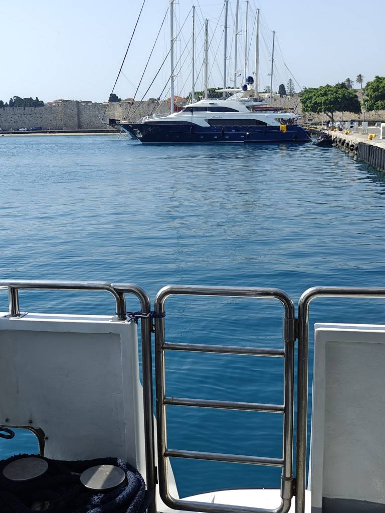 Paluu takaisin Rodoksen kaupunkiin tapahtuu tällä kertaa isomman, Dodekanisos Seawaysin Panagia Skiadeni-autolautan kyydissä. Alus lähtee hieman muita aluksia kauempaa, noin vartin kävelymatkan päässä rantakadulta. Laivalla on hieman enemmän aktiviteetteja kuin pienemmillä aluksilla ja ainakin tasaisempi matka. Suosittelen ehdottomasti menemään kannelle, josta voi valita oman fiiliksen mukaan joko varjo- tai aurinkopaikan. On myös hyvä tietää, että laivan satamapaikka on kauempana Rodoksella kuin muiden firmojen, joten kannattaa varautua siihen, että vanhaan kaupunkiin kävelee vartin verran.