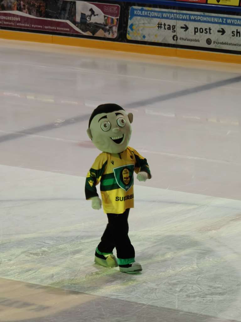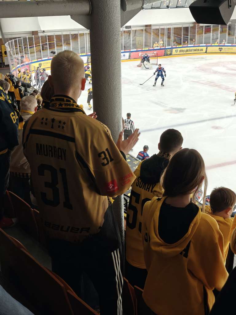 Serkkuni, joka on pelannut lätkää Puolassa, suositteli meitä menemään Katowicen kotipeliin tunnelman takia. Kaukalon molemmin puolin on ikäänkuin kolmion muodossa oleva istumakatsomo ja sen päällä seisomapaikat. Kaikki reilu tuhat istumapaikkaa on myyty loppuun kausikorttilaisille, joten hommasimme etukäteen meille seisomapaikat. Halli vetää joidenkin arvioiden mukaan noin 1300 katsojaa, joten missään Nokia Arenalla ei peliä katsota. Hallissa on hyvin tilaa, kun siirrymme ylähyllylle odottelemaan joukkueita jäälle. Lopulta pelin alkaessa istumapaikoista melkein puolet on vapaana, joten kausikorttilaiset ovat todennäköisesti keksineet parempaa tekemistä perjantai-illalle.