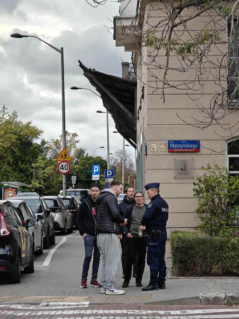 Olemme erinomaisissa sunnuntaioloissa ja siirrymme määrätietoisesti kohti pelipaikkaa. Pienenä kantona kaskessa tai hiekkana hiihtoladulla on kuitenkin paikallinen virkavalta. Lieneekö maineemme oluen ja kermaliköörin ystävänä kiirinyt jo Puolaankin, sillä muutaman sadan metrin päässä stadionilta Mailapoika meinaa joutua pidätetyksi. Puolassa julkijuopottelu on kiellettyä ja siitäkös innokas Policja innostuu, kun Mailapoika kävelee kadulla avattu Tyskie kädessään. Ensimmäisen koppalakin kielitaito ei riitä, joten tilanteen selvittämiseksi tarvitaan toista poliisia sekä Mieskarkkia, jonka puheilla matka jatkuu myös Mailapojan osalta. Ei ole kovin kaukana etteikö kissalan poika olisi halunnut jopa liittyä seuraamme katsomoon, mutta työt menivät tällä kertaa edelle. Ens kerralla sitten Piotr!